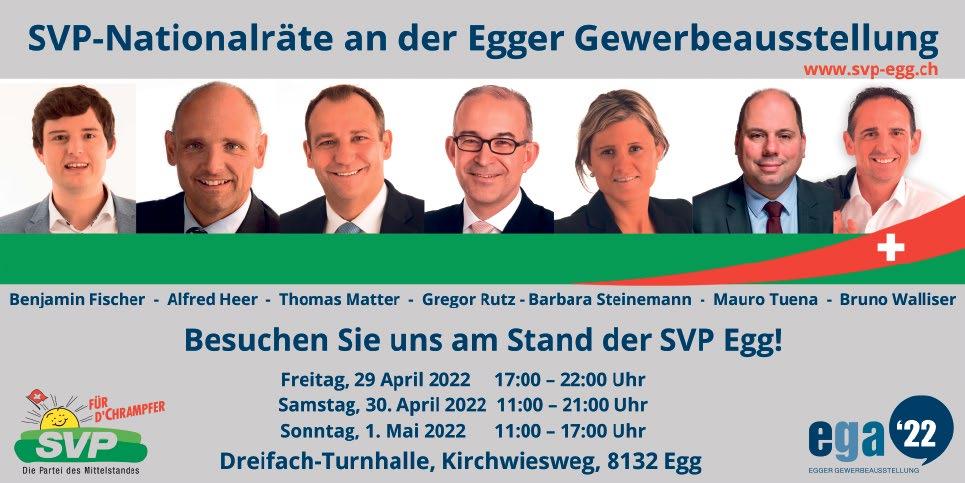 Freitag, 29 April 2022, 17 00 –22 00 Uhr, SVP-Stand an der Egger Gewerbeausstellung, Turnhalle, Kirchwiesweg, Egg, Nationalräte sind anwesend.