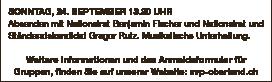Samstag, 2 September 2023, 09 00 – 14 00 Uhr, Wahlauftakt, Münsterhof, Zürich, mit Ständerat Marco Chiesa, Parteipräsident, sowie den Nationalräten Thomas Aeschi, Gregor Rutz, Alfred Heer und Mauro Tuena.