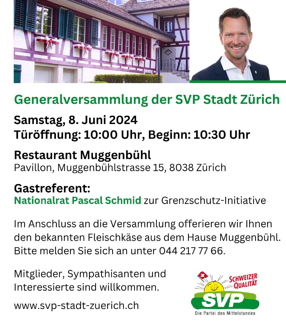 Samstag, 8 Juni 2024, 10 30 Uhr, Generalversammlung, Restaurant Muggenbühl, Muggenbühlstrasse 15, Zürich, mit Referat von Nationalrat Pascal Schmid (SVP TG) zur Grenzschutz-Initiative. Anmeldung unter 044 217 77 66
