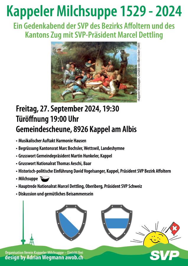 Freitag, 27 September 2024, 19 00 Uhr, Kappeler Milchsuppe, Gemeindescheune, Kappel am Albis, gemeinsame Gedenkveranstaltung der SVP Bezirk Affoltern und der SVP Kanton Zug, historisch-politische Einführung von Dr. David Vogelsanger, Bezirkspräsident. Milchsuppe offeriert. Hauptreferat von Nationalrat Marcel Dettling, Präsident SVP Schweiz, Musik Harmonie Hausen.