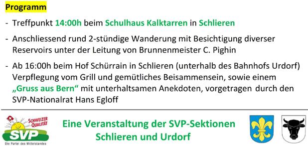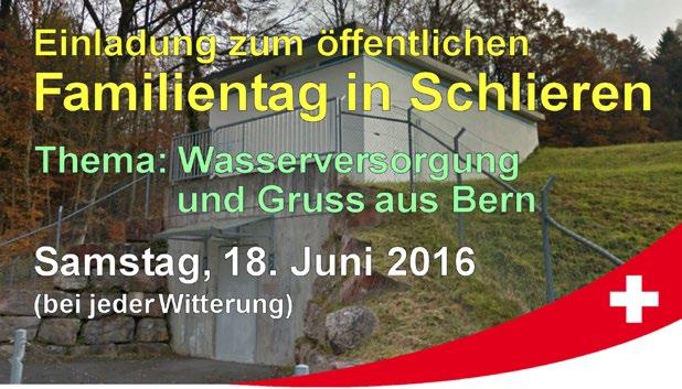 Samstag, 18. Juni 2016, Treffpunkt 14 00 Uhr, beim Schulhaus Kalktarren, Schlieren, öffentlicher Familientag, Thema: Wasserversorgung. Zweistündige Wanderung. Ab 16 00 Uhr beim Hof Schürrain (unterhalb Bahnhof Urdorf), Verpflegung vom Grill und gemütliches Beisammensein.