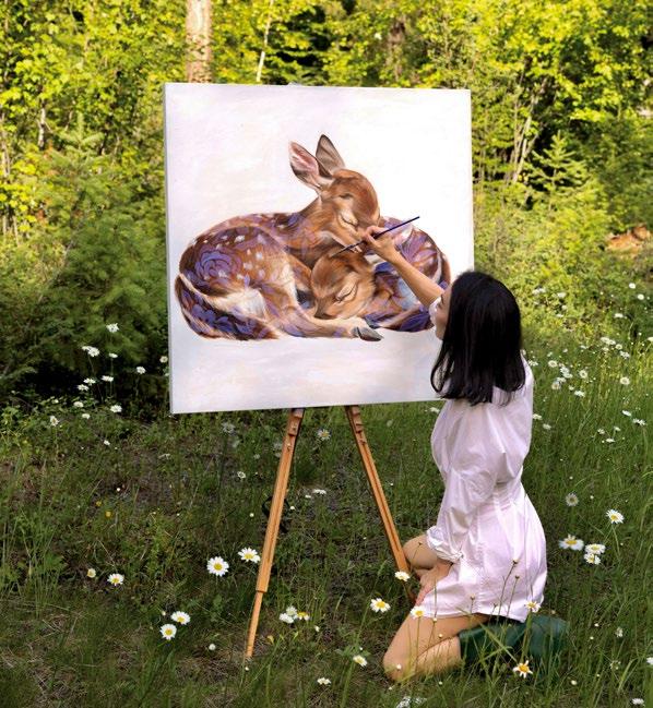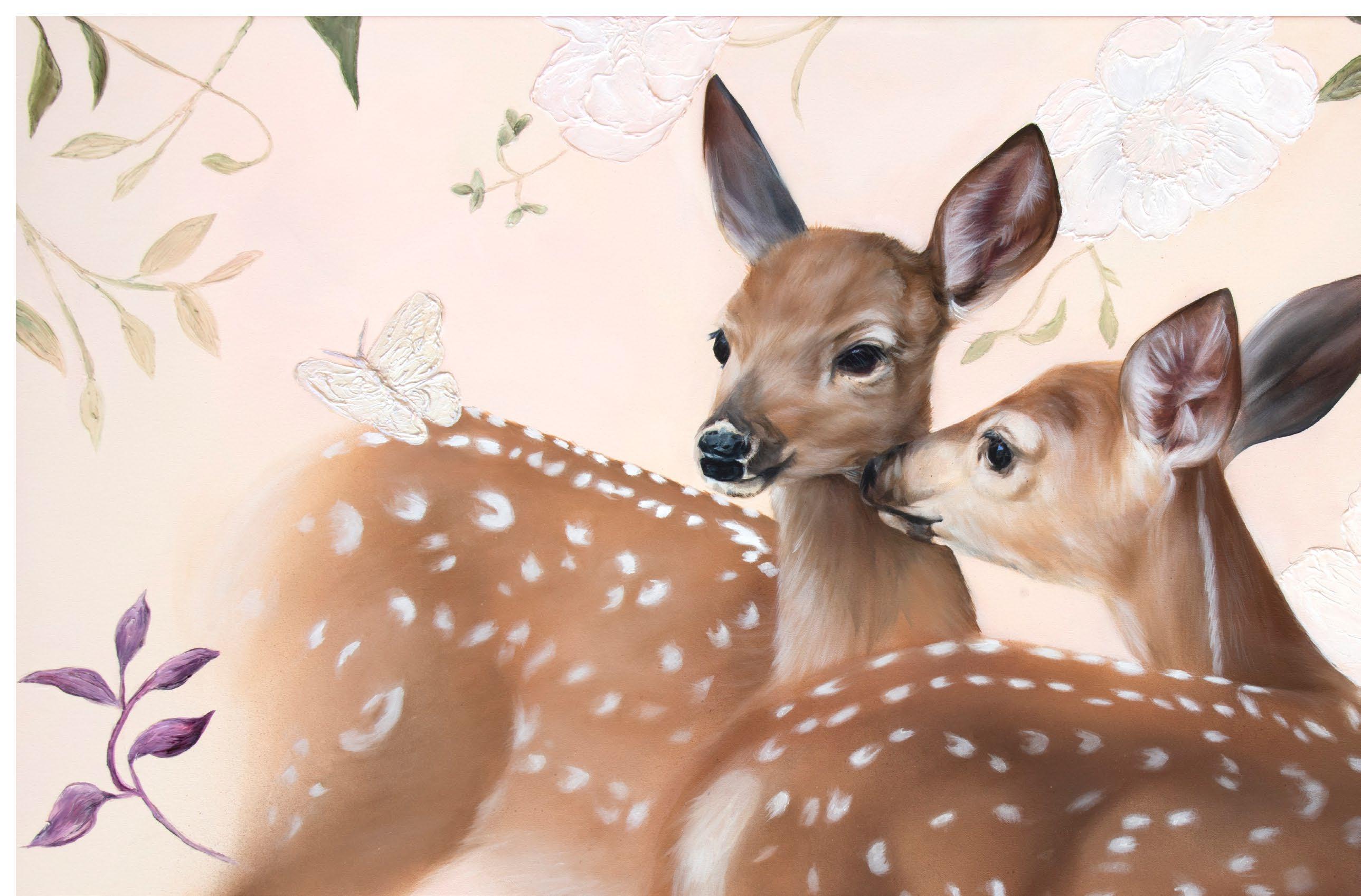 She feels a strong connection to the duality within the female deer—her quiet strength and vulnerability—and she weaves these parallels into her work. Their resilience and grace inspire her, and through her paintings, she explores themes of femininity, vulnerability, and empowerment, always hoping that others will find their own reflections within the layers of the natural world she portrays.