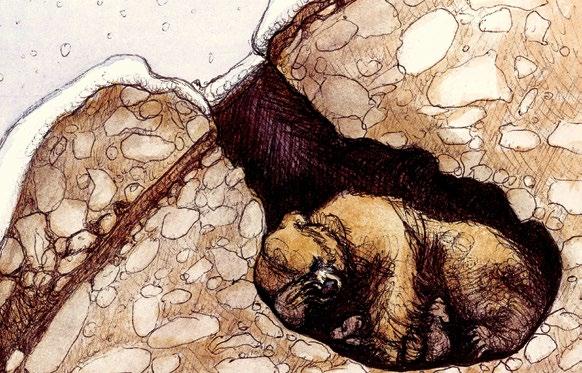 Wolverines are well-adapted to cold, snowy conditions and, due to their large feet, can travel over deep snow more easily than other carnivores. In addition to having snowshoe-like paws that keep them afloat in deep powder, they have claws that act like crampons and enable them to scale icy, rugged terrain. While many wildlife species go dormant in the winter months, wolverines are adapted to thrive in these conditions. They have frost-resistant fur that sheds snow and ice. They are also known to bury and cache scavenged carrion (aka dead animals), relying on the natural insulation of snow and freezing temperatures to preserve these food sources. In the Northern Rockies, wolverines give birth in February-March, when winter conditions prevail, and dens are typically at least one meter deep, providing protection from predators and insulation for the newborn kits to stay warm.