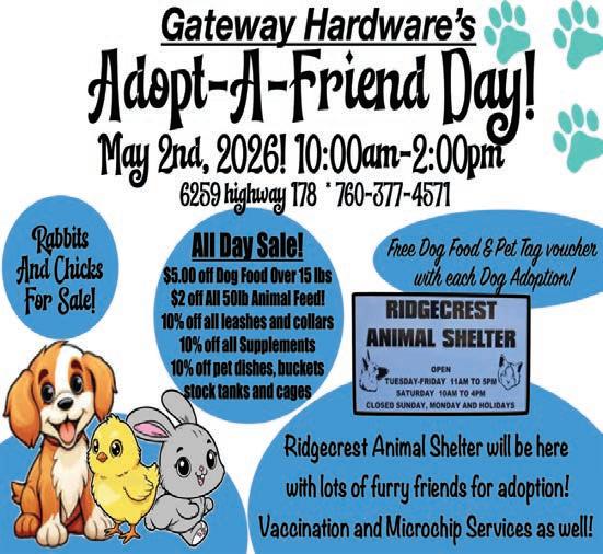 Day at Gateway Hardware with the Ridgecrest Animal Shelter! Dog/Cat adoption day! May 2nd! 10am-2pm. Gateway Hardware, 6259 Highway 178. 760-377-4571. 04/09