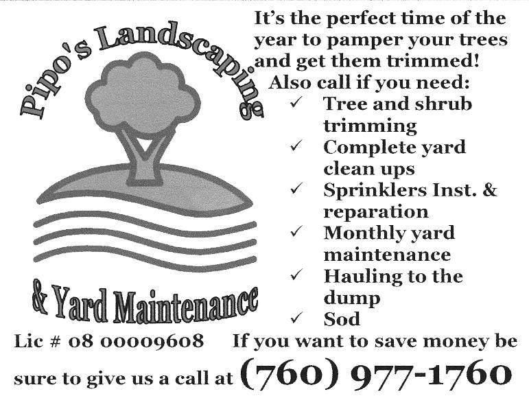 BOBCAT, BACKHOE, TRENCHING, & dump truck services available. 760793-6002 or 760377-3469. TFN