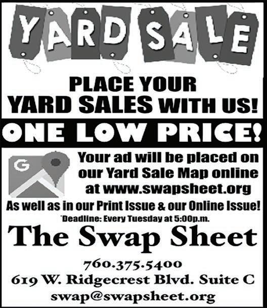 Classified Ad with us starting at $4.68 for 10 words! Your ad will be online, in print, & on our yard sale map! The Swap Sheet: 760-375-5400. 619 W. Ridgecrest Blvd. Suite C. swap@swapsheet.org.