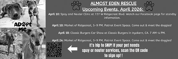 at Gateway Hardware with the Ridgecrest Animal Shelter! Dog/Cat adoption day! May 2nd! 10am-2pm. Gateway Hardware, 6259 Highway 178. 760-377-4571. 04/23
