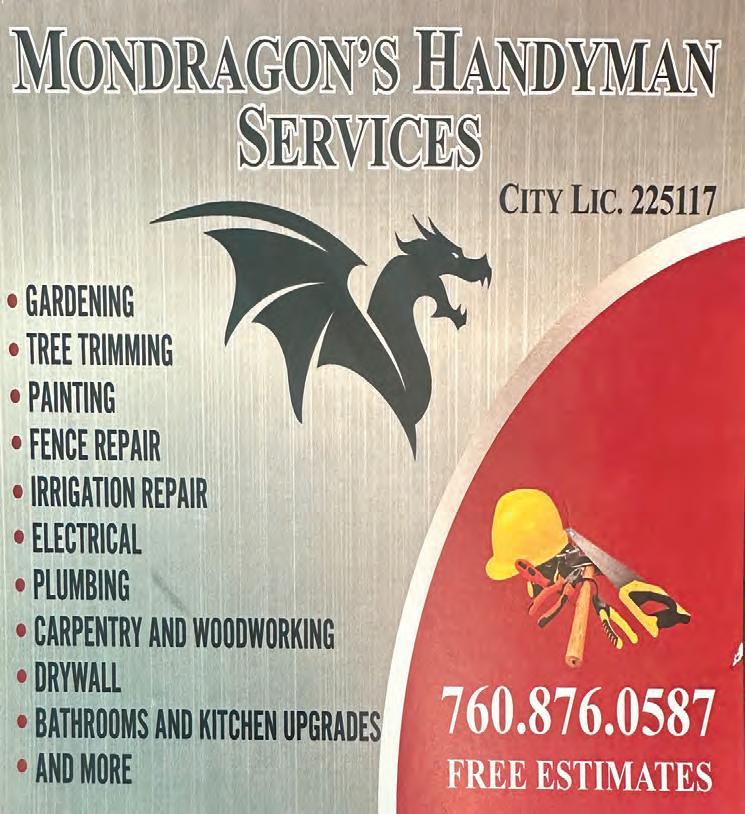 2 BeDROOM 2 bath in park. $950 plus $950 deposit. Nonsmoking, no pets, fenced, trash paid. Call Monday through Friday 7:30AM – 4:30PM 760-446-6600. 04/30 PLEASE CHECK YOUR ads, if there is an error, we are responsi-