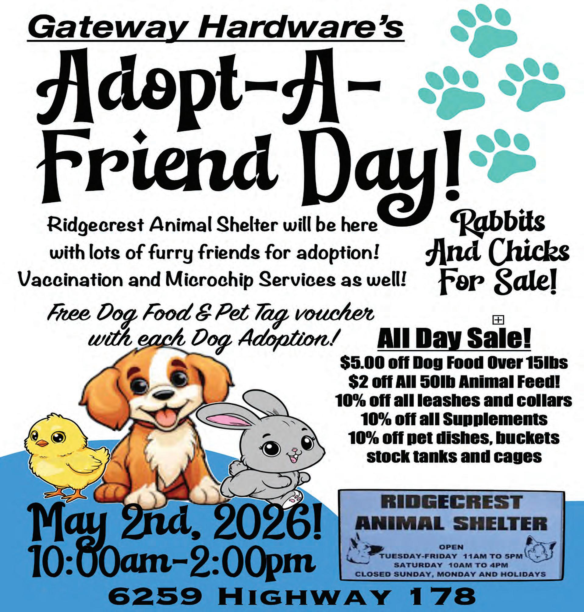 Day at Gateway Hardware with the Ridgecrest Animal Shelter! Dog/Cat adoption day! May 2nd! 10am-2pm.