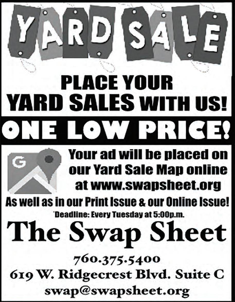 YARD SALe! Used furniture and appliances, great selection. 805 N China Lake Blvd. Hours: Friday 9am - 4pm, Saturday 9am - 2pm. 04/30