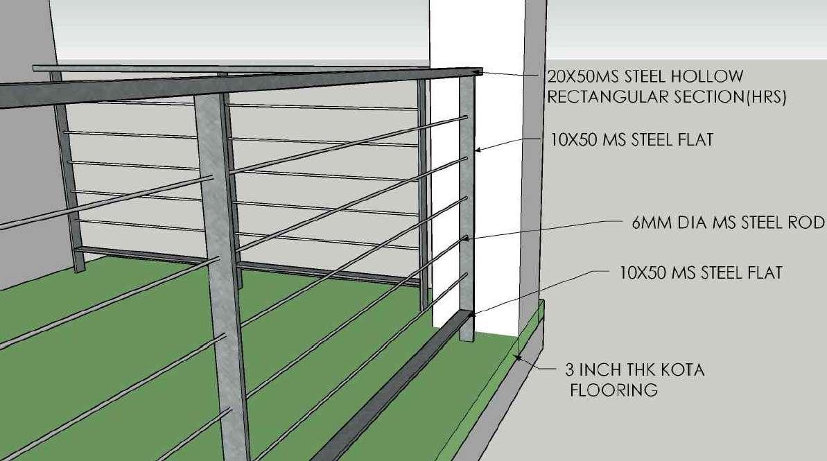 A PLAN A 3" THK KOTA FLOORING 6MM DIA MS STEEL ROD 20X50 MS STEEL HOLLOW REECTANGULAR SECTION 10X50 MS STEEL FLAT 5" THK RCC SLAB 5" 3" 3'-4" 5 1 2 " 4 5 8 " 4" EQ EQ 14'-11 2 " 14'-91 2 " 14'-91 2 " EQ EQ EQ EQ 50MM EQ 50MM EQ EQ EQ EQ EQ 10X50 MS STEEL FLAT RAILING DESIGN ELEVATION FROM A PLAN KEY PLAN