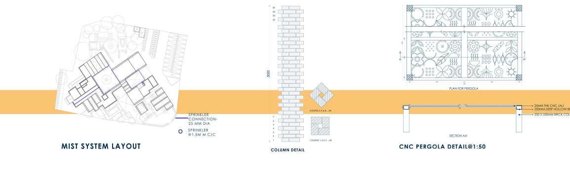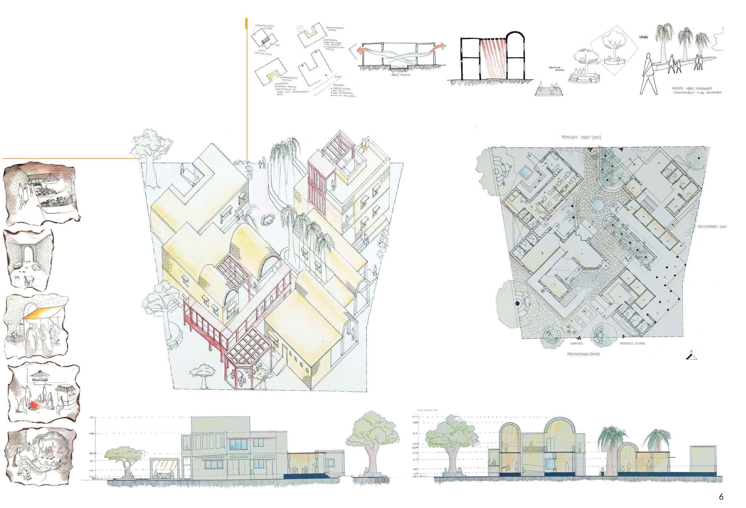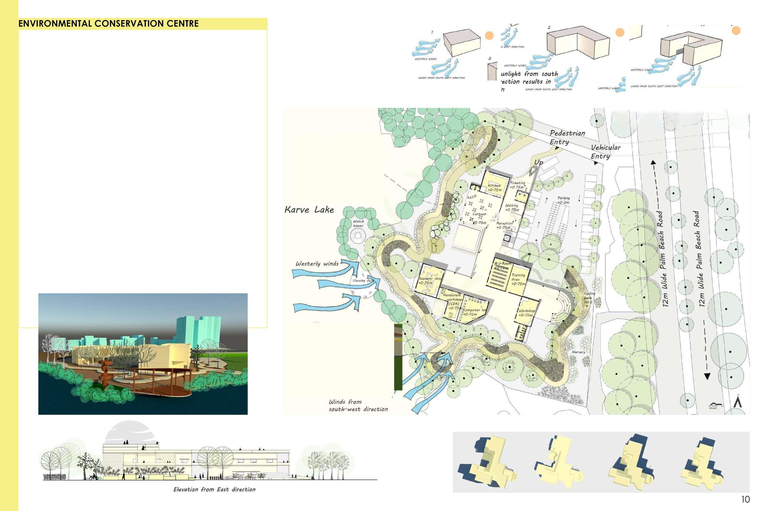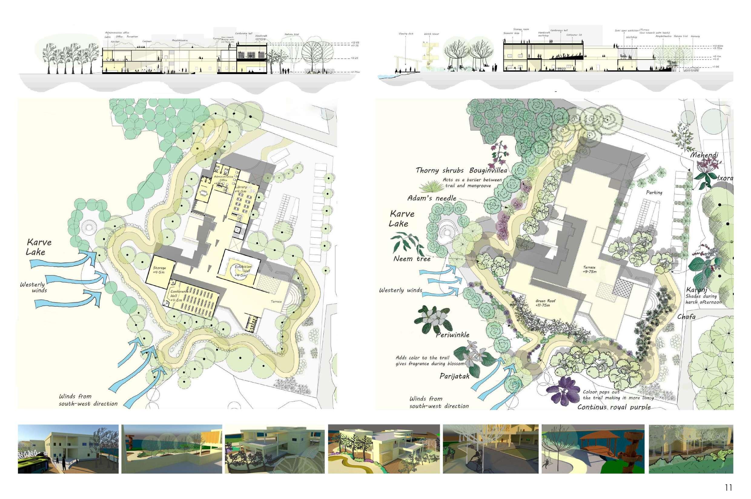 The developed land in Navi Mumbai is situated between two ecologically significant areas: the hill slopes of Parsik and the coasts alongside Thane Creek. Navi Mumbai boasts a creek line spanning 150 km, encompassing various water bodies and mud flats that harbor diverse flora and fauna. This particular site is nestled within one of these developable areas, surrounded by numerous gaothans (villages). The Environmental Centre serves as a bridge between the local community and the ecological systems, facilitating interaction between gaothan residents and other visitors to enhance awareness and promote conservation efforts. The design focuses on creating spaces where people can appreciate and understand the importance of preserving the ecology, particularly mangroves and associated flora and fauna. These spaces are intricately connected to the surroundings and are designed to engage all five senses, enriching the human experience while navigating through them.