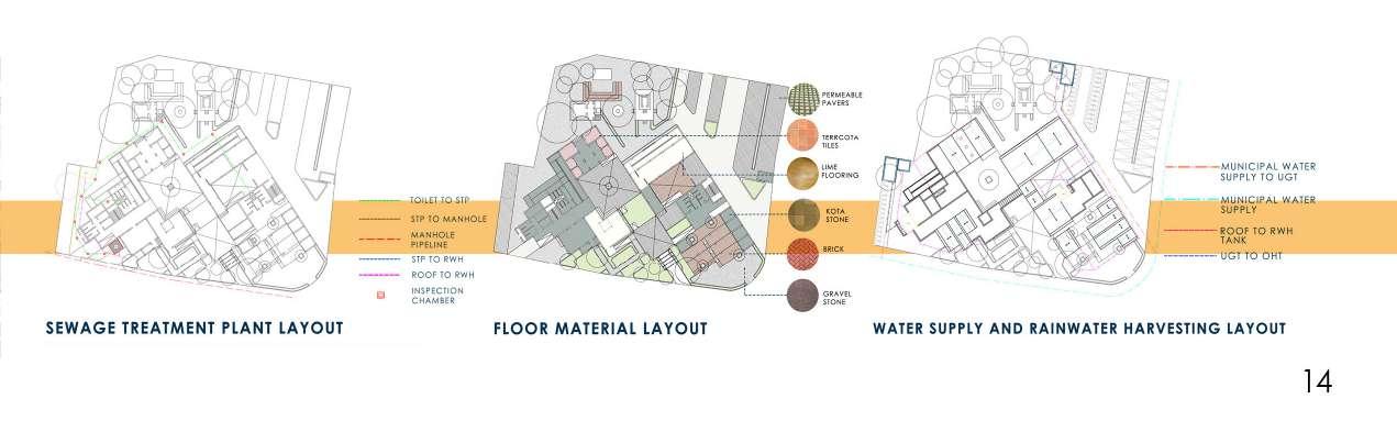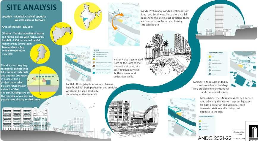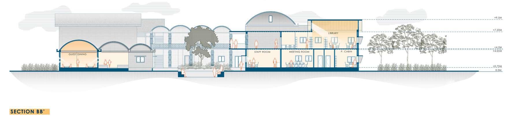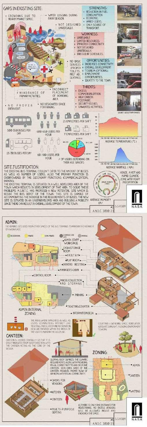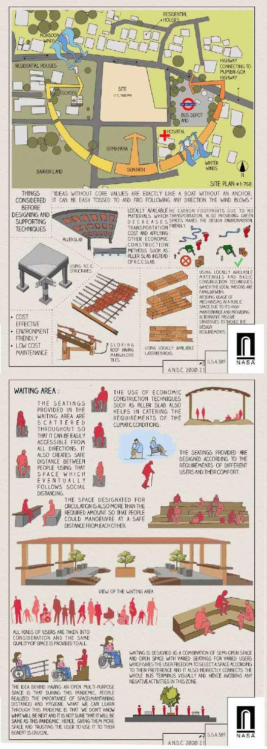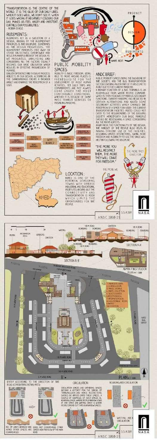 The developed land in Navi Mumbai is situated between two ecologically significant areas: the hill slopes of Parsik and the coasts alongside Thane Creek. Navi Mumbai boasts a creek line spanning 150 km, encompassing various water bodies and mud flats that harbor diverse flora and fauna. This particular site is nestled within one of these developable areas, surrounded by numerous gaothans (villages). The Environmental Centre serves as a bridge between the local community and the ecological systems, facilitating interaction between gaothan residents and other visitors to enhance awareness and promote conservation efforts. The design focuses on creating spaces where people can appreciate and understand the importance of preserving the ecology, particularly mangroves and associated flora and fauna. These spaces are intricately connected to the surroundings and are designed to engage all five senses, enriching the human experience while navigating through them.