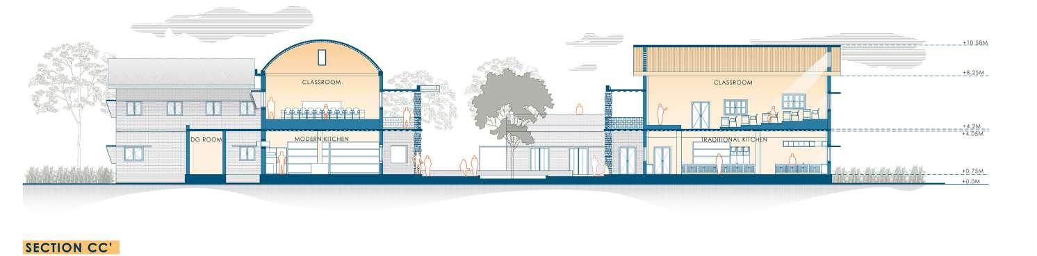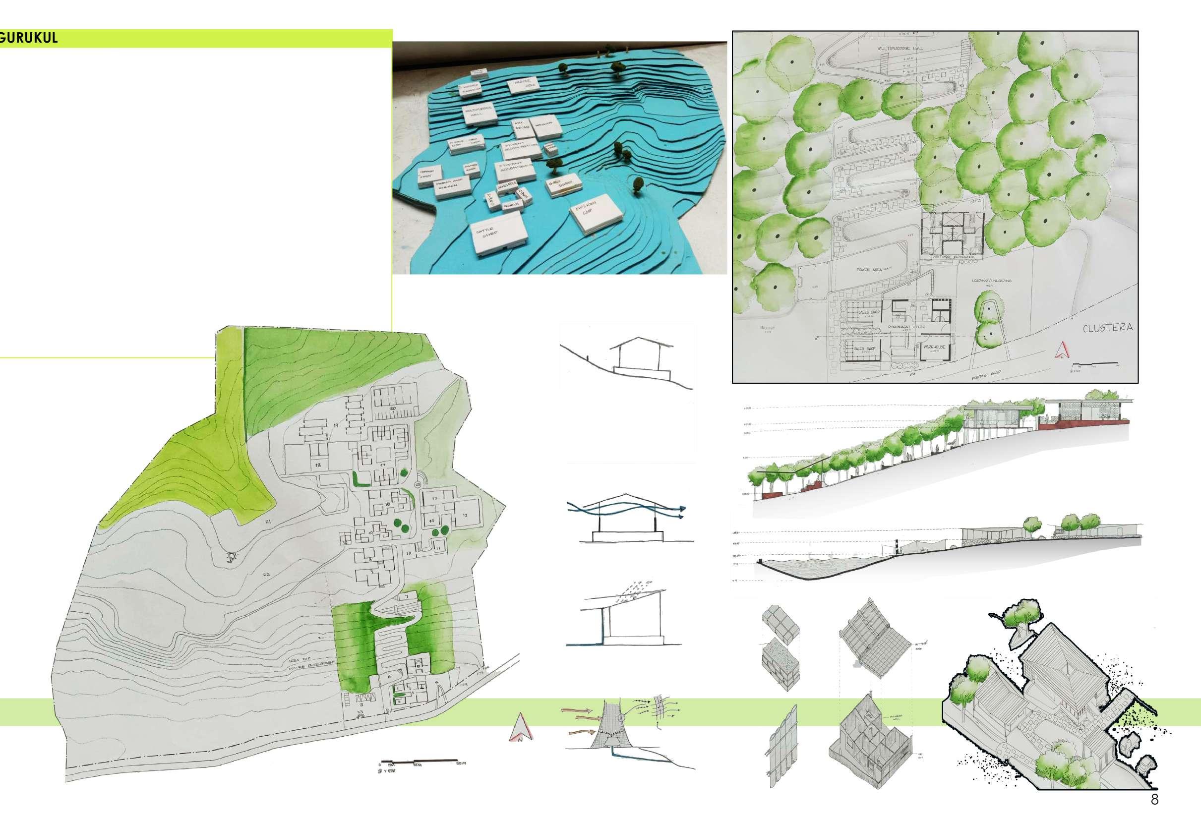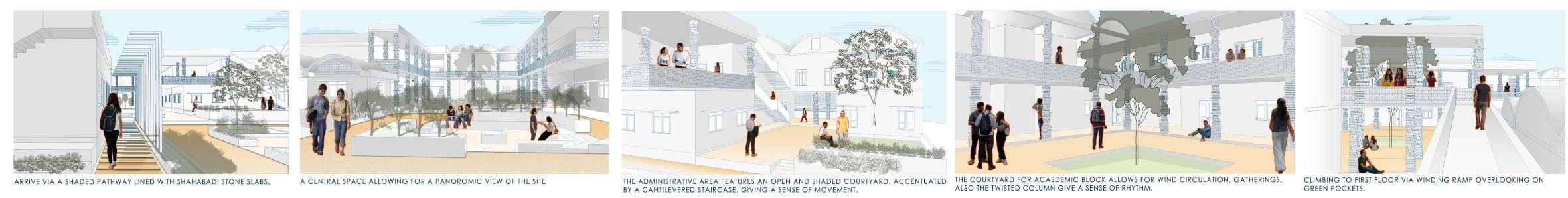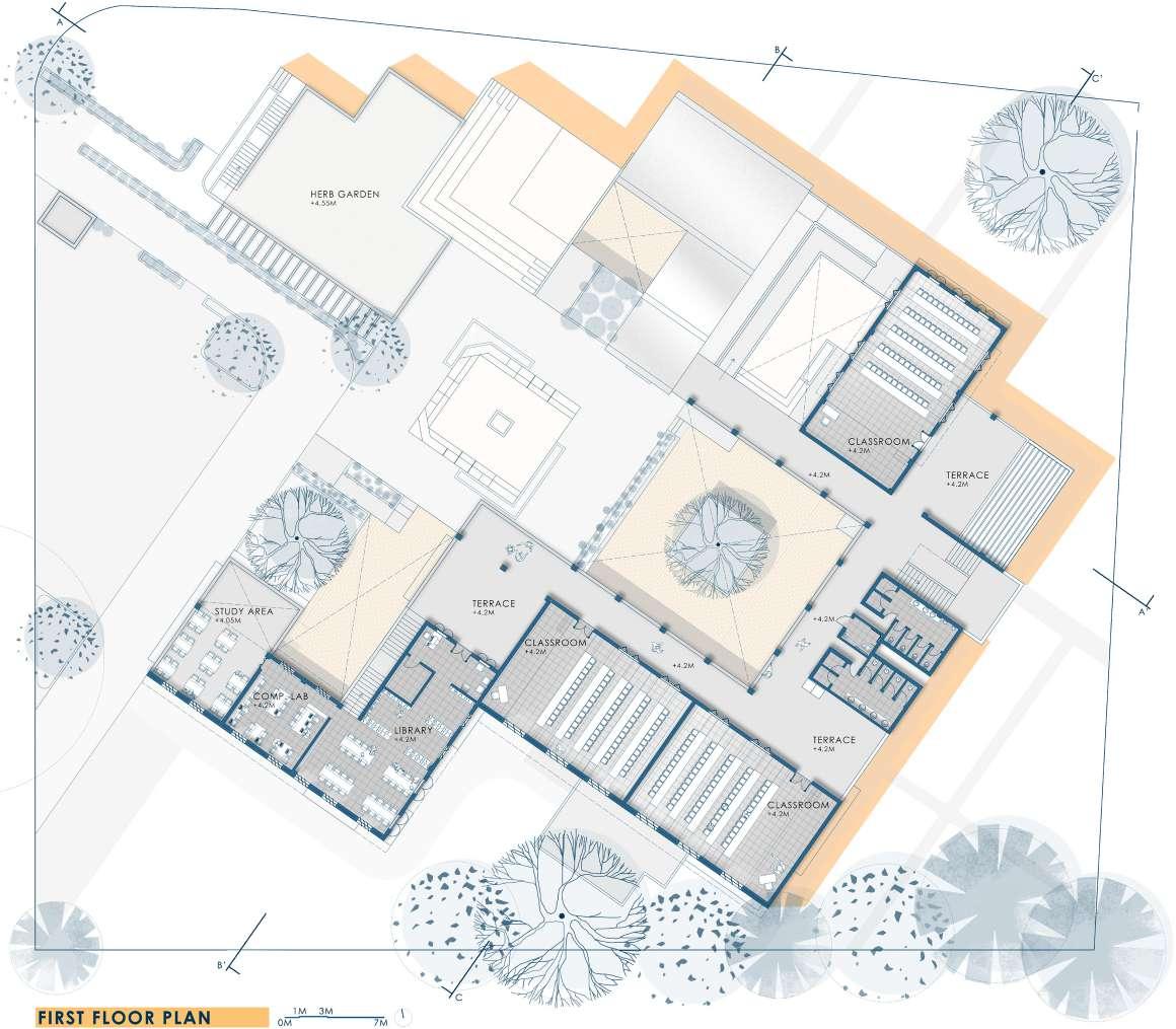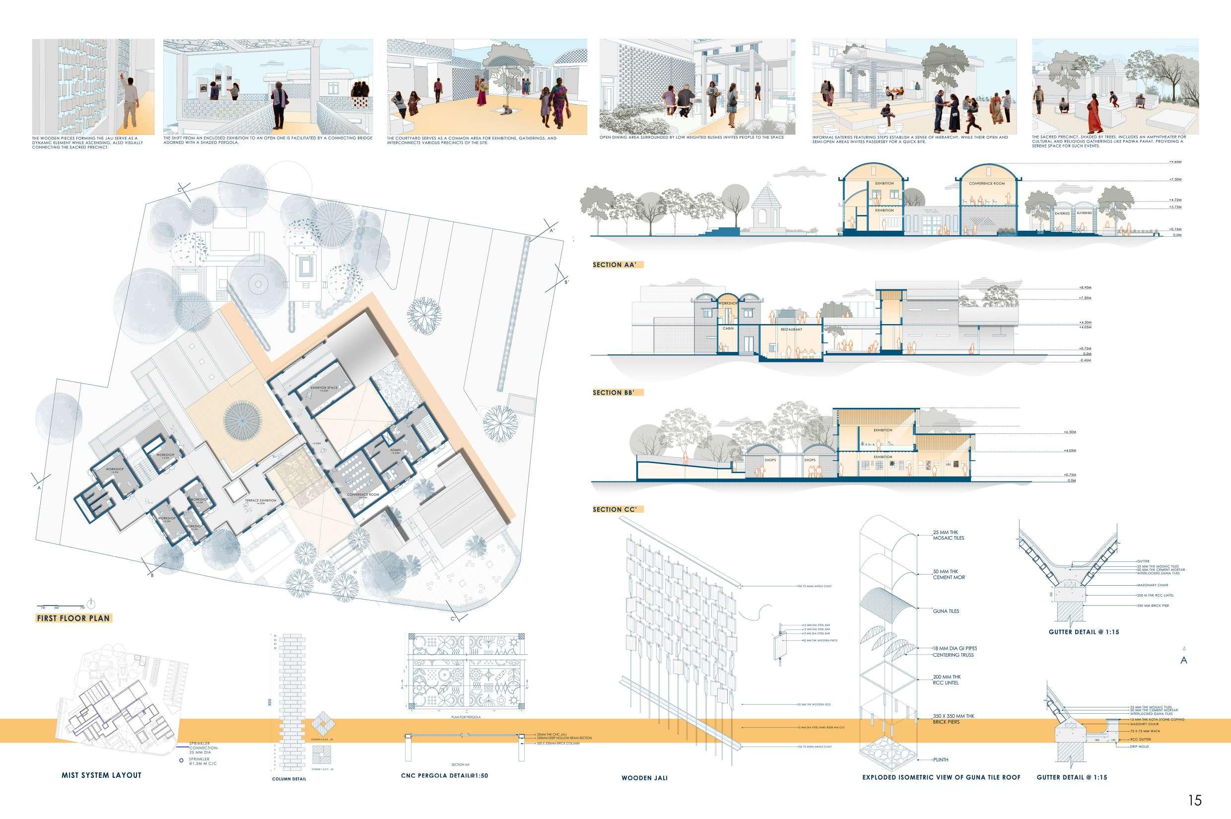 The developed land in Navi Mumbai is situated between two ecologically significant areas: the hill slopes of Parsik and the coasts alongside Thane Creek. Navi Mumbai boasts a creek line spanning 150 km, encompassing various water bodies and mud flats that harbor diverse flora and fauna. This particular site is nestled within one of these developable areas, surrounded by numerous gaothans (villages). The Environmental Centre serves as a bridge between the local community and the ecological systems, facilitating interaction between gaothan residents and other visitors to enhance awareness and promote conservation efforts. The design focuses on creating spaces where people can appreciate and understand the importance of preserving the ecology, particularly mangroves and associated flora and fauna. These spaces are intricately connected to the surroundings and are designed to engage all five senses, enriching the human experience while navigating through them.