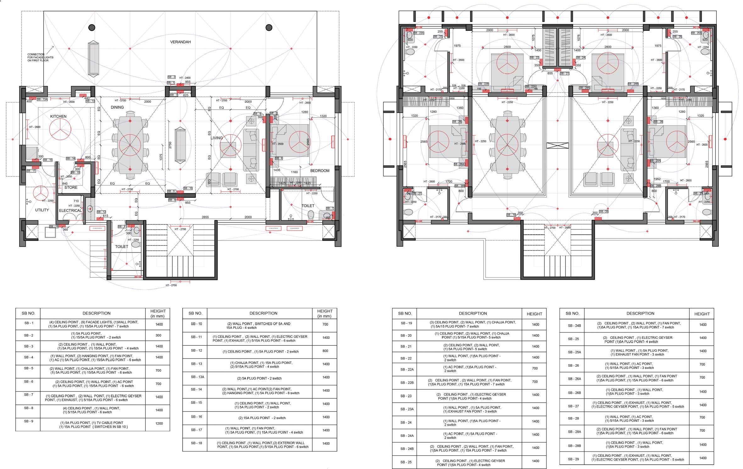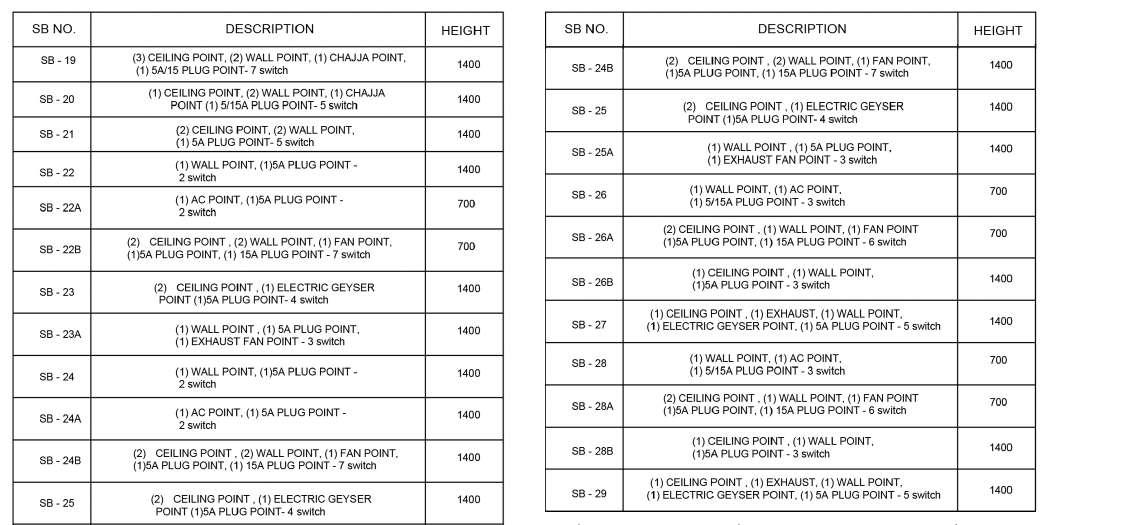 25 KITCHEN 23' x 10' STORE ROOM 12'3" x 8' UTILITY AREA 10' x 15' VERANDAH 33' 9" x 10' P A S S A G E 5' W I D E TOILET 10' x 15' LVL -5'3" CHANGING ROOM 10' x 9'6" EQ EQ EQ EQ EQ EQ EQ EQ EQ EQ EQ EQ EQ EQ EQ EQ EQ EQ EQ EQ EQ EQ EQ EQ 8'-3" 6'-6" 8'-3" CEILLING POINT WALL POINT SWITCH BOARD FAN POINT EQ EQ EQ EQ EQ EQ EQ EQ EQ EQ EQ EQ th design studio 5'-9" 5' 4'-5" 4'-91 2 4'-91 2 4'-91 2 4'-91 2 4' EQ EQ EQ EQ 1'-11 4 " EQ EQ EQ EQ 3'-4" 3'-4" 3'-4" EQ 1'-6" EQ EQ 3'-9" 2'-01 2 2'-101 2 81 2 EQ EQ 13'-11 2 " 20'-6" 6'-91 2 SB- 40 EQ SB- 41 SB- 43 SB- 42 SB- 44 1'-6" SB- 45 SB- 47 SB- 48A SB- 46 SB- 49 SB- 50 SB- 51 SB- 51A SB- 51B SB- 52 SB- 52A ELECTRICAL LAYOUT SB NO. DESCRIPTION HEIGHT SB- 40 (3) FLOOR POINT, (1) 5A PLUG POINT- SWITCHES 2'-6" SB- 41 (5) CEILING POINT, (1) 5A PLUG POINT- 2 SWITCHES 2'-6" SB- 42 (2) WALL POINT, (2) WALL POINT (TWO WAY), (2) CEILING POINTS, (2) FAN POINT, (2) 5A PLUG POINT- 7 SWITCHES 4'-6" SB- 43 (2) WALL POINT, (2) CEILING HIGHLITER POINT, (2) FAN POINT, (2) 5A PLUG POINT- SWITCHES 4'-6" SB- 44 (1) CEILING POINT, (3) WALL POINT- 3 SWITCHES 4'-6" SB- 45 (1) CEILING POINT, (1) WALL POINT, (1) 5A PLUG POINT SWITCHES 4'-6" SB- 46 (2) WALL POINT,(1) HANGING POINT (1) 5A PLUG POINT- 4 SWITCHES 4'-6" SB- 47 (1) WALL POINT, (2) 15A PLUG POINT- SWITCHES 4'-6" SB- 48 (1)15A PLUG POINT- 1 SWITCHES 4'-6" SB- 48A (1) WALL POINT, (2)5/15A PLUG POINT- 3 SWITCHES 3'-0" SB- 49 (2) HANGING POINT, (1) FAN POINT, (1) 5/15A PLUG POINTSWITCH 2'-6" SB- 50 (1) HANGING POINT, (1) FAN POINT, (1) 5/15A PLUG POINTSWITCHES 4'-6" SB- 51 (2) WALL POINT, (1) 5A PLUG POINT- SWITCHES 4'-6" SB- 51A (1) WALL POINT, (1) 5A PLUG POINT- SWITCHES 4'-6" SB- 51B (2) WALL POINT- SWITCHES 4'-6" SB- 52 (1) WALL POINT, (1) 5A POINT- SWITCHES 4'-6" SB- 52A (2) WALL POINT 1 SWITCH 4'-6" EQ 1'-6" SB- 48 EQ EQ EQ EQ 2'-8" EQ EQ HT- 8'6" HT- 8'6" HT- 8'6" HT- 8'6" HT- 8'6" HT- 8'6" HT- 8'6" HT- 8'6" HT- 8'6" HT- 8'6" HT- 8'6" HT- 8'6" HT- 8'6" HT- 8'6" HT- 8'6" HT- 8'6" HT- 8'6" HT- 8'6" HT- 8'6" HT- 8'6" EQ 81 2 TWO WAY CEILING POINT WALL POINT FOOT LIGHT POINT SWITCH BOARD FAN POINT HANGING POINT LEGEND LIVING 21' 10" x 15' HT- 8'6" 7'-21 2 7'-51 4 7'-21 2 7'-6" 7'-6" 7'-6" 3'-91 2 3'-91 2 3'-81 2 " 3'-81 2 7'-6" 1'-71 2 " 8'-3" 9'-21 2 7'-51 2 1'-41 2 4'-103 4 4'-11" 4'-61 4 SB- 26 SB- 24 SB- 25 ELECTRICAL LAYOUT SB NO. DESCRIPTION HEIGHT SB- 24 (1) WALL POINT, (2) HANGING POINT, (1) FAN POINT, (2) 5/15A PLUG POINT- SWITCHES 2'-6" SB- 25 (3) WALL POINT, (1) FAN POINT, (2) 5A PLUG POINTSWITCHES ₹3.00 SB- 26 (1) 5A PLUG POINT, (1) TV CABLE POINT (1) 15A PLUG POINT SWITCHES IN SB 27 4'-6" SB- 27 (2) WALL POINT, (1) HANGING POINT, (1) FAN POINT, (2)5/15A PLUG POINT, SWITCHES OF 5A AND 15A FROM SB 26SWITCHES ₹3.00 EQ EQ SB- 27 TWO WAY HT- 8'6" HT- 8'6" HT- 8'6" HT- 8'6" HT- 8'6" 3'-01 4 2'-81 4 " th design studio HANGING POINT WALL POINT FOOT LIGHT POINT SWITCH BOARD FAN POINT TABLE LAMP EXHAUST FAN POINT LEGEND CEILING POINT UPPER COURTYARD 36' x 36' P A S S A G E 5' W I D E P A S S A G E 5' W I D E P A S S A G E 10' W I D E BEDROOM 15' x 13' VERANDAH 7' x 10'6" VERANDAH 15' x 6' BEDROOM BATHROOM BATHROOM 8' x 10' UP OTS LVL +2'4" LVL +00 LVL +2'4" 5' A C A C HT- 8'6" HT- 8'6" HT- 10' HT- 7' HT- 7' 2' 3'-93 4 5'-41 2 " 9" 1'-33 4 " 83 4 " 3'-3" 5'-6" 3'-3" EQ EQ EQ EQ EQ EQ EQ EQ 9" 5'-6" SB- 6 SB- 2 SB- 3 SB- 7 SB- 8 SB- 10 SB- 9 CENTRE OF NICHE AT EXTREME TOP ABOVE NICHE 9" 3'-9" 3'-1" 3'-5" 8'-3" 7'-6" EQ EQ 81 4 " EQ EQ 3'-3 1 2 6'-81 2 1'-93 4 " 6'-21 4 EQ EQ 6'-31 2 " 6'-6" 6'-6" 11'-8 1 2 2'-81 4 3'-93 4 3'-93 4 2'-81 4 2'-03 4 " 5'-51 4 " 2'-3" 3'-9" FOR WALL POINT OF UPPER FLOOR 11'-9" 2'-101 2 2'-6" HT- 7' 5'-6" 8'-3" 2'-41 2 2'-6" SB- 1 SB- 13 SB- 14 SB- 11 8'-3" 81 2 SB- 6A 1'-6" 1'-9" SB- 7A SB- 9A 2'-11" 1'-71 2 SB- 10A SB- 12 SB- 14A SB- 11A 9'-01 4 " ELECTRICAL LAYOUT SB NO. DESCRIPTION HEIGHT SB- 1 (2) WALL POINT, (4) LANDSCAPE LIGHT POINT, (1) 5/15A PLUG POINT- 7 SWITCHES BELOW COPING LVL SB- 1A (2) CEILING HIGHLITER POINT- 1 SWITCH BELOW COPING LVL SB- 1B (2) CEILING HIGHLITER POINT- 1 SWITCH BELOW COPING LVL SB- 2 (1) CEILING POINT, (1) WALL POINT(TWO WAY)- 2 SWITCHES 4'-6" SB- 3 (3) WALL POINT, (2) HANGING POINT, (1) 5A PLUG POINT-3 SWITCHES 2'-6" SB- 4 (3) WALL POINT, (3) HANGING POINT- 3 SWITCHES 2'-6" SB- 5 (1) CEILING POINT, (1) WALL POINT (TWO WAY)- 2 SWITCHES 4'-6" SB- 6 (2) CEILING POINT - SWITCHES 4'-6" SB- 6A (1) WALL POINT, (1) 5/15A PLUG POINT- 2 SWITCHES 3'-0"