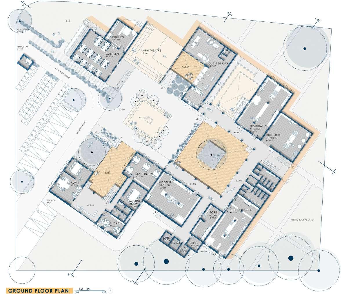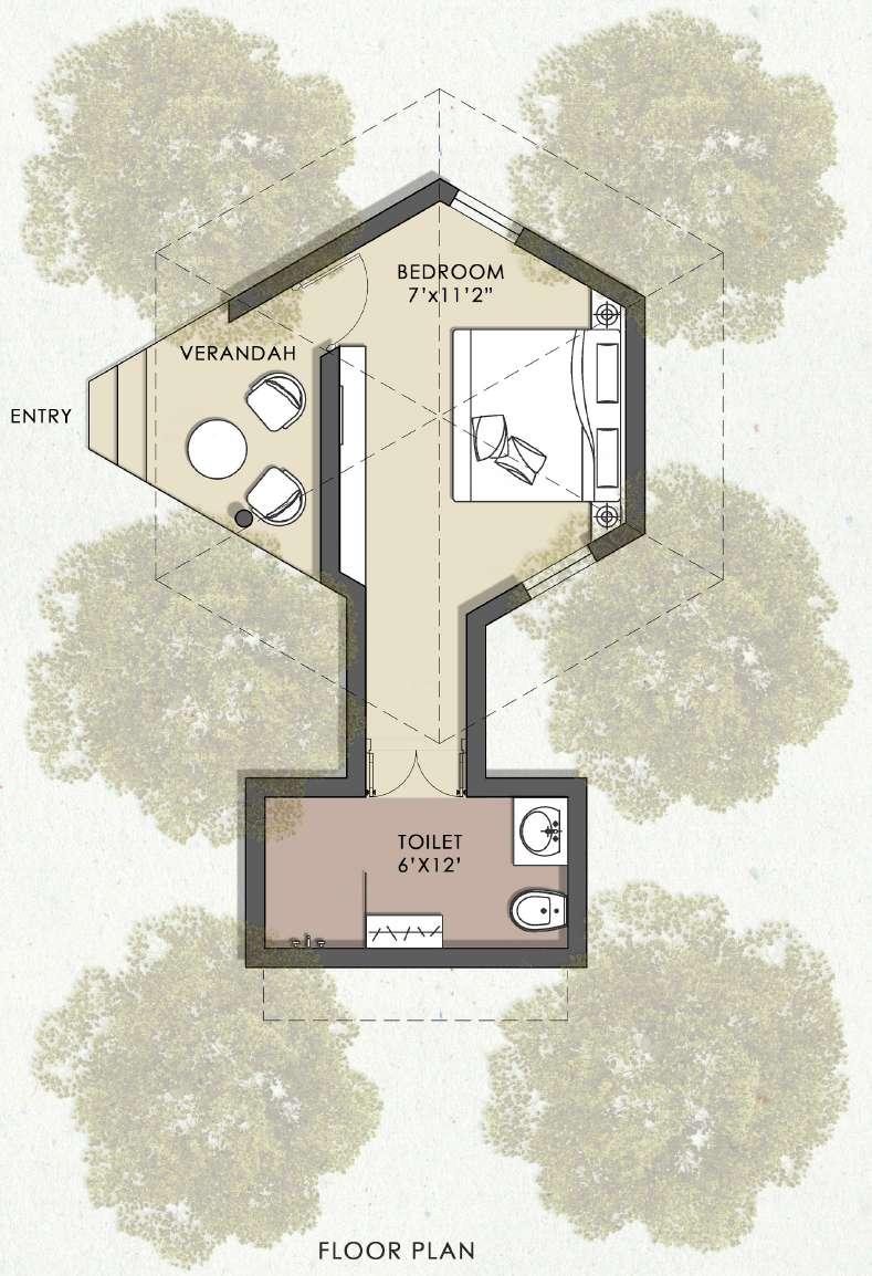 A resort in Hyderabad in middle of mango grove. Construction was done with latterite stone and mangalore tiles majorly. Planning for one such cottage in the grid of trees and the foundation plan for the same was designed.