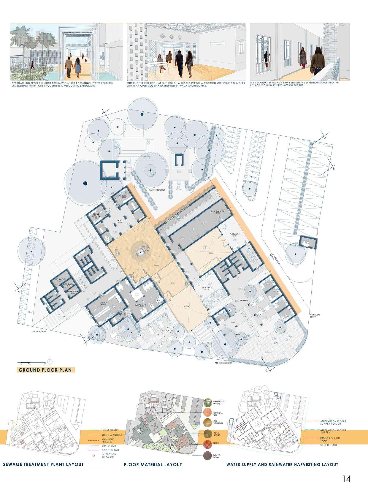 The developed land in Navi Mumbai is situated between two ecologically significant areas: the hill slopes of Parsik and the coasts alongside Thane Creek. Navi Mumbai boasts a creek line spanning 150 km, encompassing various water bodies and mud flats that harbor diverse flora and fauna. This particular site is nestled within one of these developable areas, surrounded by numerous gaothans (villages). The Environmental Centre serves as a bridge between the local community and the ecological systems, facilitating interaction between gaothan residents and other visitors to enhance awareness and promote conservation efforts. The design focuses on creating spaces where people can appreciate and understand the importance of preserving the ecology, particularly mangroves and associated flora and fauna. These spaces are intricately connected to the surroundings and are designed to engage all five senses, enriching the human experience while navigating through them.