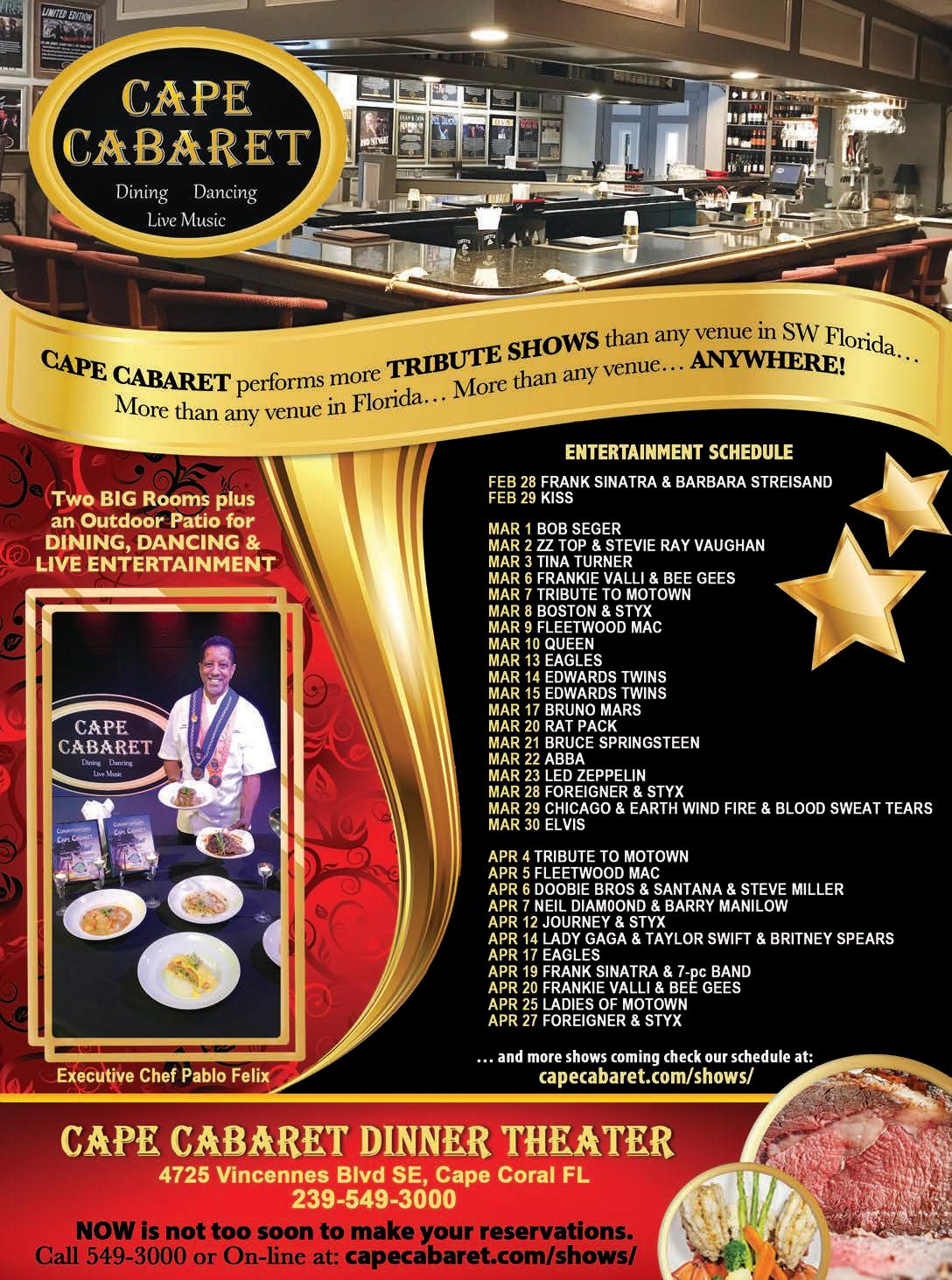 CapeCabaretDinner Theaterisabeautiful upscalevenuededicated todining,dancing,live musicandcomedyshows. Wefeatureacomplete dinnermenu,threefull bars,twolargedining roomswithhardwood dancefloorsandalarge outdoorpatio.Ourentertainmentincludeslive musicfromthe60’stothe90’sandthebesttributeband showsinSWFL.Wespecializeinhostingyourprivateevents andpartiesfor24to350guests.ExecutiveChefPabloFelix andhisstaffpreparedeliciousappetizers,entreesand dessertsdailyforyourenjoyment.Walk-insarewelcome,but reservationsarerecommended.Reserveonlineorcall.