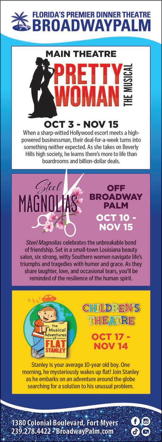 BroadwayPalm DinnerTheatrepresentsPrettyWomanthe musicalOct.3throughNov.15in FortMyers.