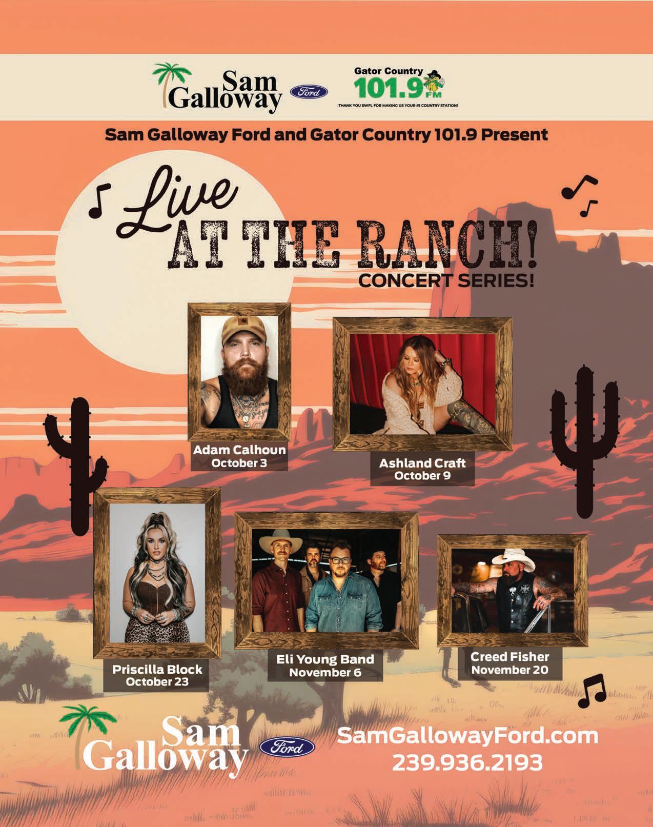 OtherupcomingshowsatThe RanchConcertHall(notpartofthe SamGallowaySeries)include90s HonkeyTonkCircusTouronOct.4,Ty MyersonOct.24,SteelPantheron Nov.7,TheExpendablesonNov.13 andJoshMeloyonMarch21,2026. Forticketsandmoreconcertinfo, visittheranchfortmyers.com.