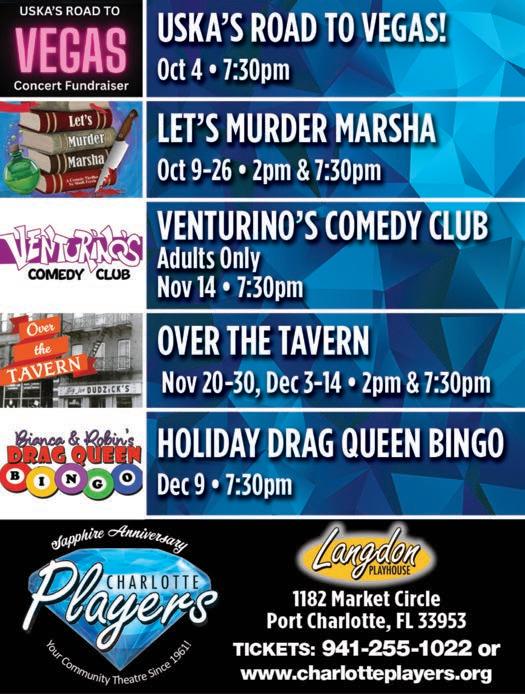 Ahighlightoftheseason,the13thAnnualComedyfora CausereturnsOct.24atTheTwistedFork.Thissignature fundraiserfeatureslocalcommunityleadersperforming unscriptedimprovskitsinacoveredoutdoorvenue.Tickets are$95fordinnerandshow,or$40forshow-onlyadmission. Memberships,seasonsubscriptions,andindividualtickets arenowavailable.Forthelatestupdates,showtimes,and ticketinformation,visitwww.charlotteplayers.orgorcall941255-1022.TheCharlottePlayers’LangdonPlayhouseis locatedat1182MarketCircle,PortCharlotte.