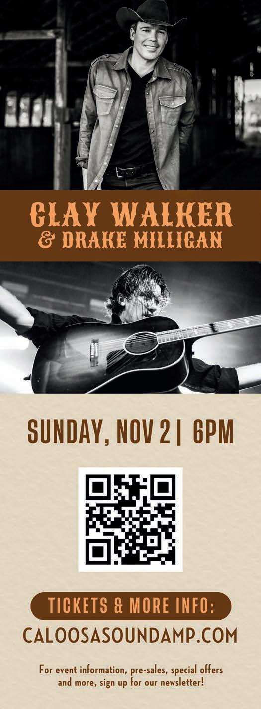 CaloosaSoundAmphitheaterpresentscountrymusiclegendClayWalker andspecialguestDrakeMilliganfora '90sCountryRevivalonSunday,Nov.2 at7p.m.