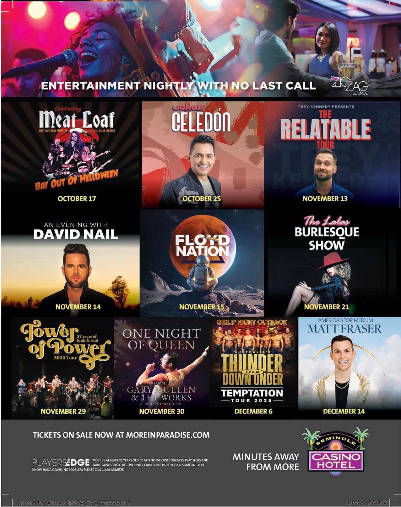 CelebratingMeatLoaf:BatOutofHelloweenwillperform Friday,Oct.17at8p.m.atSeminoleCasinoHotel Immokalee.ThisconcertfeaturesMeatLoafband membersandAmericanIdolwinnerCalebJohnson. Forticketsandinfo,visitmoreinparadise.com