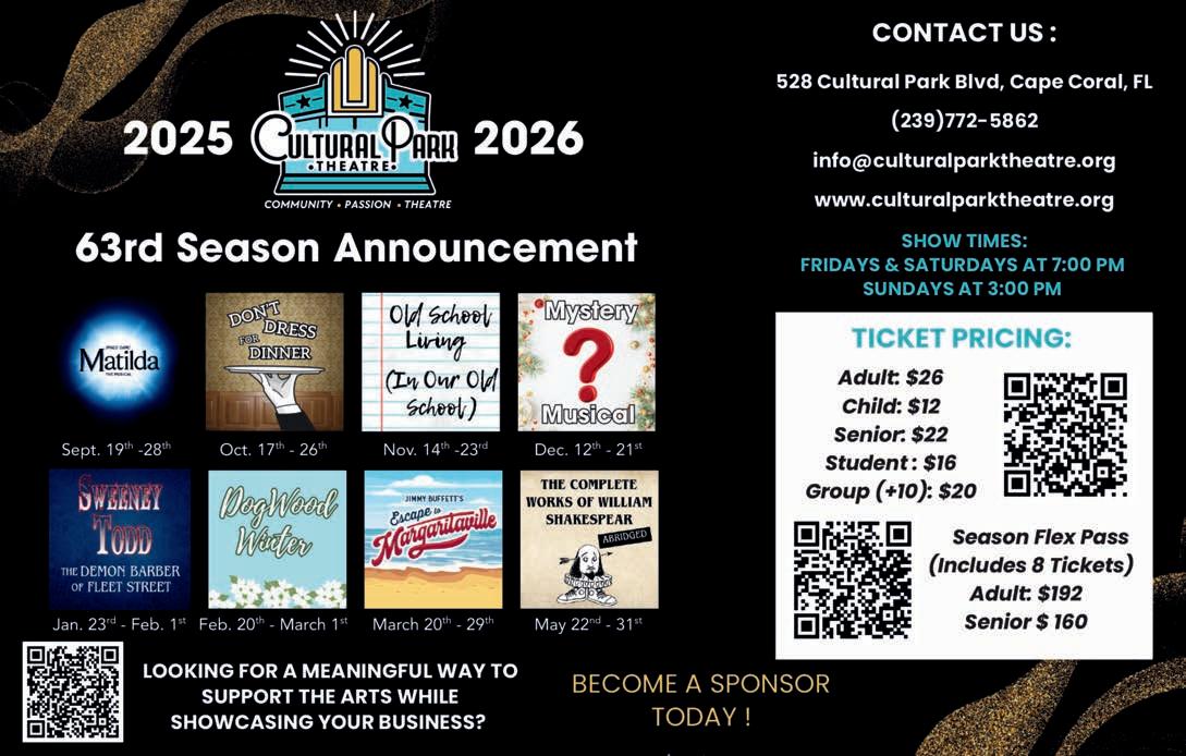 Joinusforamemorable monthofperformances,communityspirit,andgivingat CulturalParkTheatre. CulturalParkTheatreis locatedat528CulturalPark Blvd.inCapeCoral. Formoreinformation,call 239-772-5862.