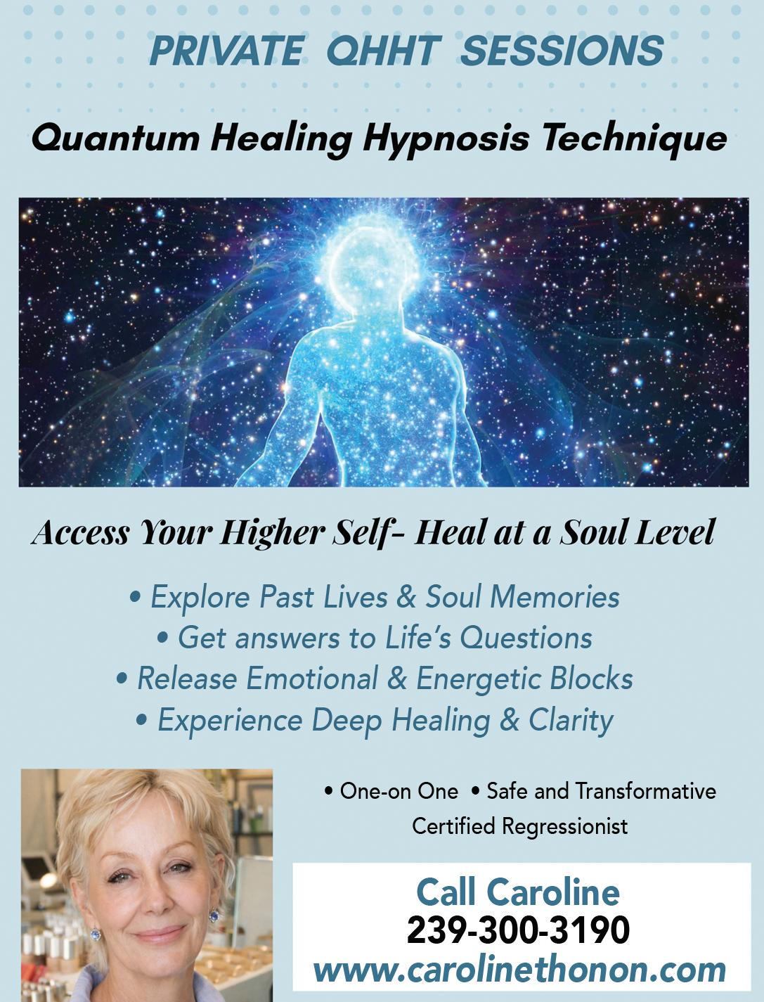 QHHt Trained Dolores Cannon: Access your Higher Self, Heal at the Soul level. Explore past lives - Get answers - Release Emotional Blocks - Experience Deep Healing & Clarity. See ad, page 29 for Caroline Thonon.