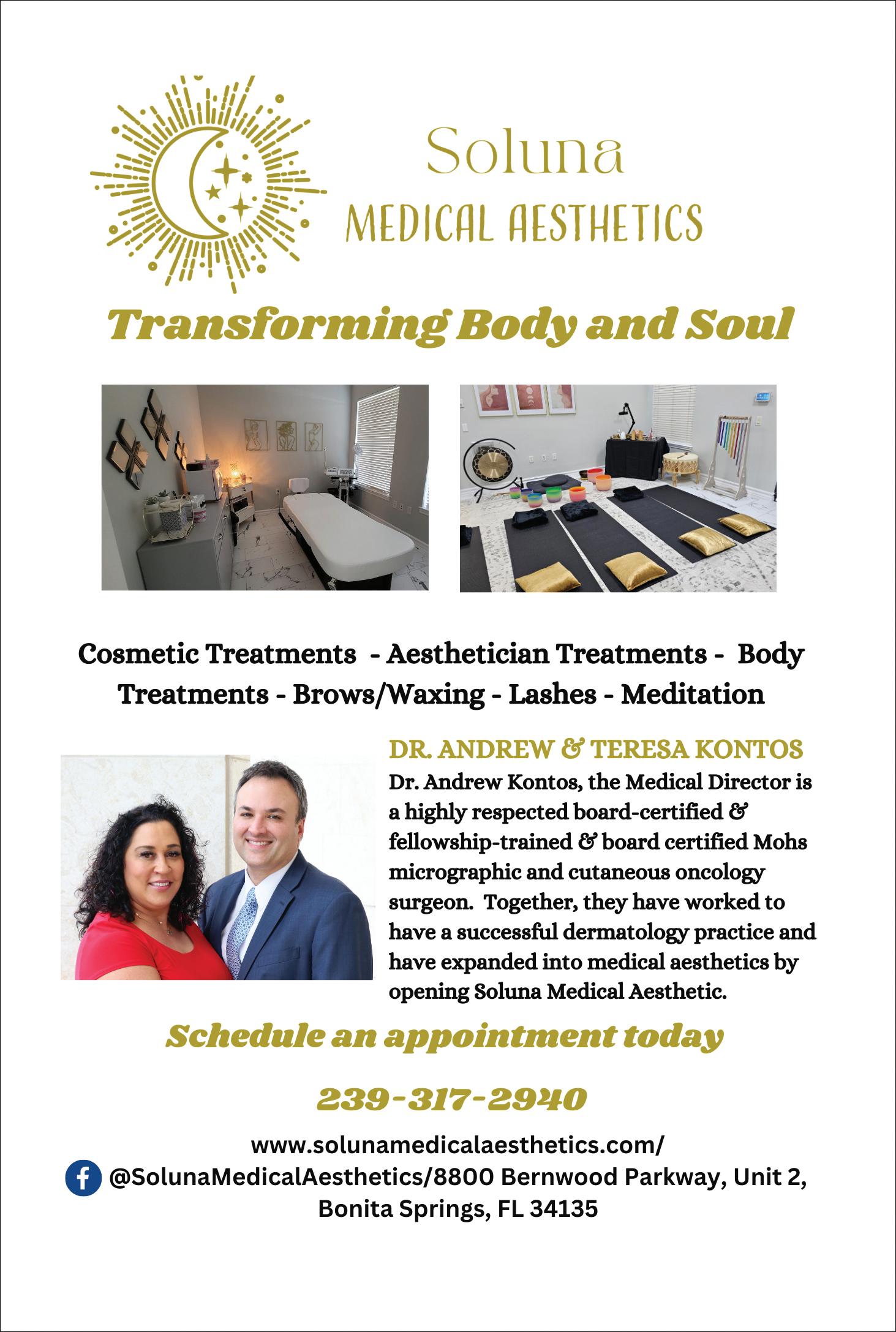 Location: 8800 Bernwood Pkwy., Ste. 2. For more information or to make an appointment, call 239-317-2940 or visit SolunaMedicalAesthetics.com. See ad on page 12.