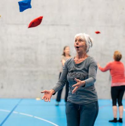 Le plein de motivation Retour dans la salle de gym. Au programme, un exercice de coordination avec de petits sacs lestés. Par équipes de deux, sur commande de leur partenaire, les femmes doivent faire glisser un sac avec un pied vers l’avant ou vers l’arrière, tandis que les bras, avec l’autre sac, s’étirent vers le haut ou sur le côté du corps. Le défi, explique Daniela Sonderegger-Meuli, c’est que ces exercices doivent solliciter des personnes de 60 à 85 ans ayant des conditions physiques très