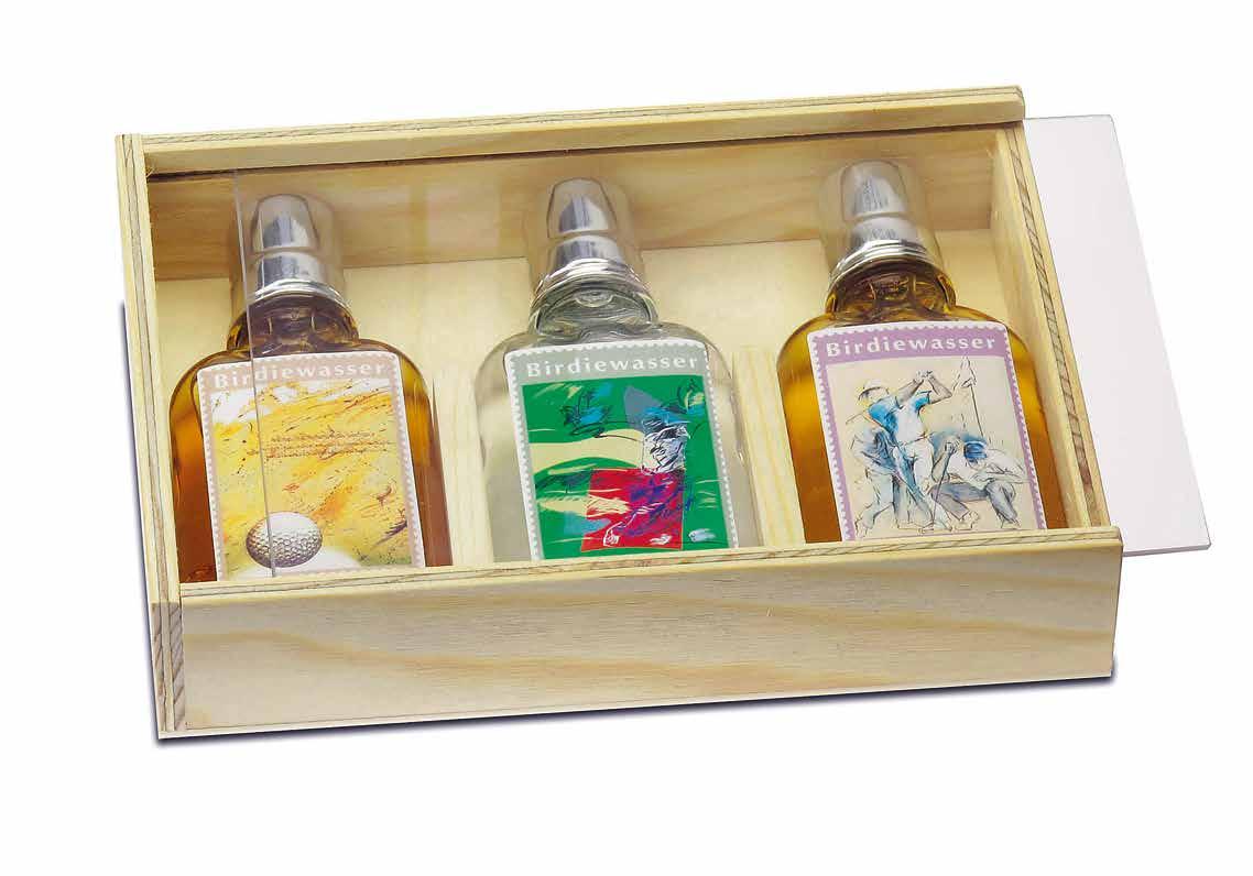 Ein Dreierset Birdiewasser vom Feinsten. Vieille Prune mit Goldflitter, Crisp Pink Apfel, Vieille Poire Williams mit Goldflitter. Die hochwertigen und harmonischen Inhalte stammen alle aus Schweizer Produktion. Liebevoll verpackt in einer handgefertigten Holzbox mit einem Plexiglas-Schieber. Erhältlich für 115 Franken im onlineshop bei golfart.ch