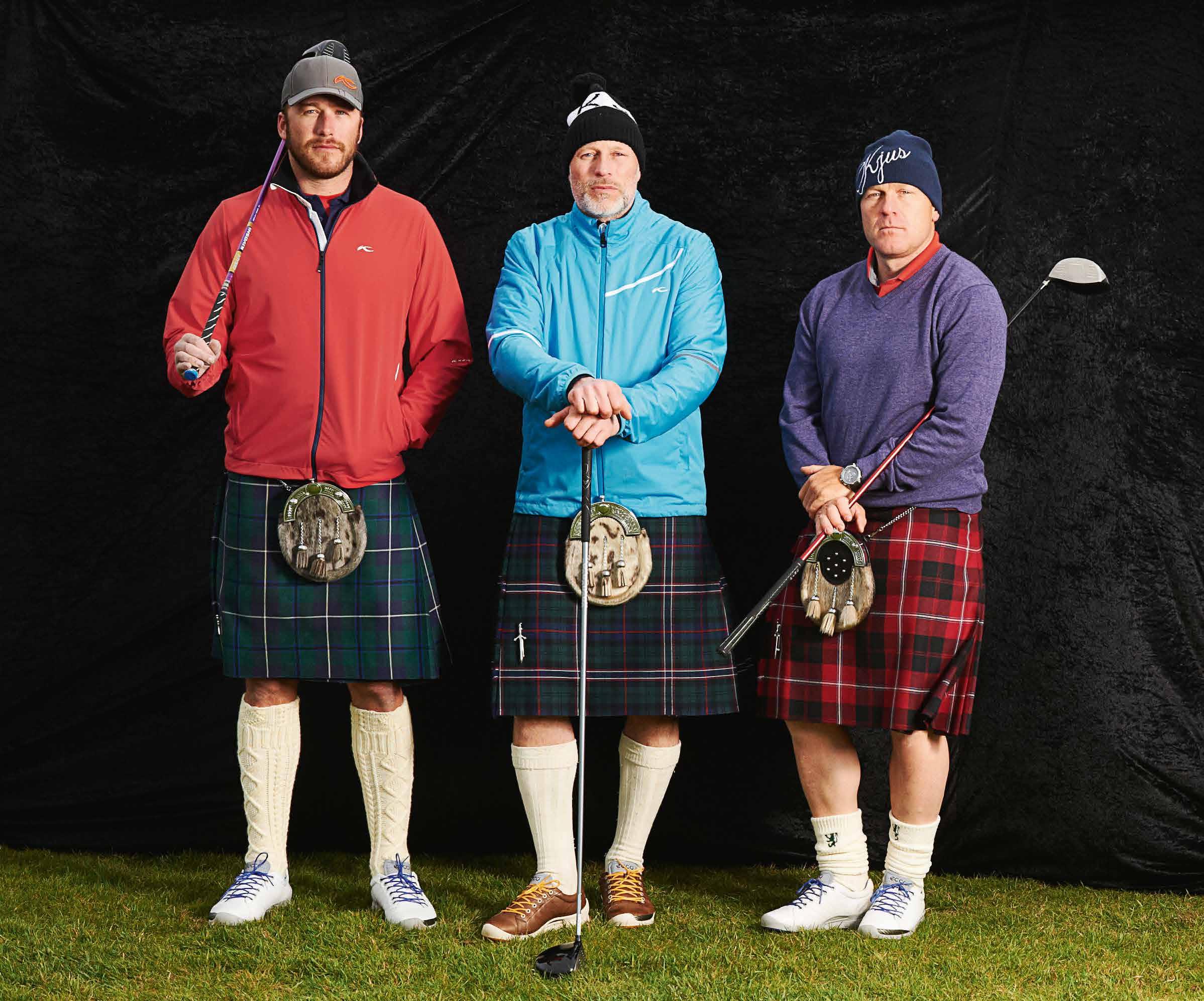 Dass die drei keine Schönwetter-Sportler sind, beweisen Cuche, Miller und Kjus auch auf dem Golfplatz beim Materialtest. Das Fazit von Didier nach der Golfrunde auf schottischem Boden: «Design und Funktionalität – Kjus ist für mich kompromisslose Bekleidung in jeder Situation.»
