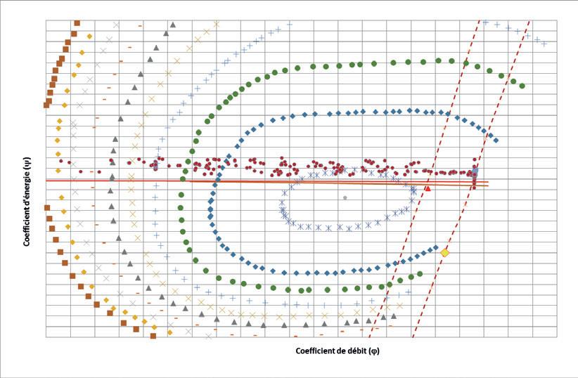 Figure 2. Colline de rendements correspondant à la turbine Pelton de la Louve, avec les points de fonctionnement, en rouge foncé, correspondant à la journée du 31.05.2018, et le losange jaune correspondant à la pression minimale de fonctionnement admissible à pleine charge. Mhylab Mhylab utilise les coefficients ϕ pour le chiffre de débit et Ψ pour le chiffre d'énergie, lesquels sont définis comme suit pour les turbines Pelton :
