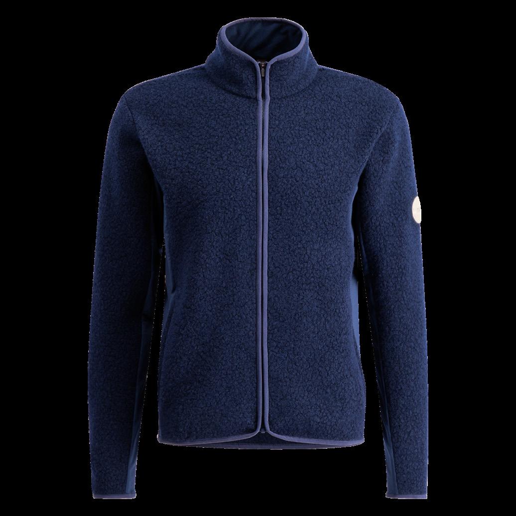 3-layer softshell ski jacket with elastic brushed panels for warmth and mobility. Features include adjustable hem, zippered hand pockets, and reflective sleeve details.