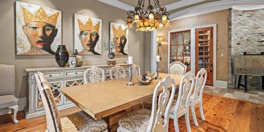 purchased as mementos from visits to Sicily. They are joined by the faces of kings, complete with crowns, that look out from paintings designed specifically for the Favre family home by Iran-born New Orleans artist David Harouni. A metal sculpture of an olive tree and platters from the Puglia Region also hint at the room’s Italian influence.