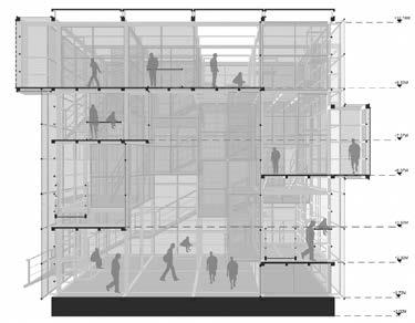 The Form of the building is a Cube. The periphery is a continuous gallery and the centre is an Atrium. The exterior and interior surfaces are articulated by balconies which are strategically composed over the installation. The skin of the building is made using expanded steel mesh which gives the building an ethereal quality.
