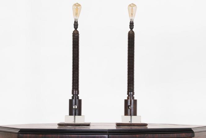 A pair of turned wooden wine-press column lamps, 19th century and later, each mounted on a stepped square Perspex and wooden base, adapted, 22cm wide