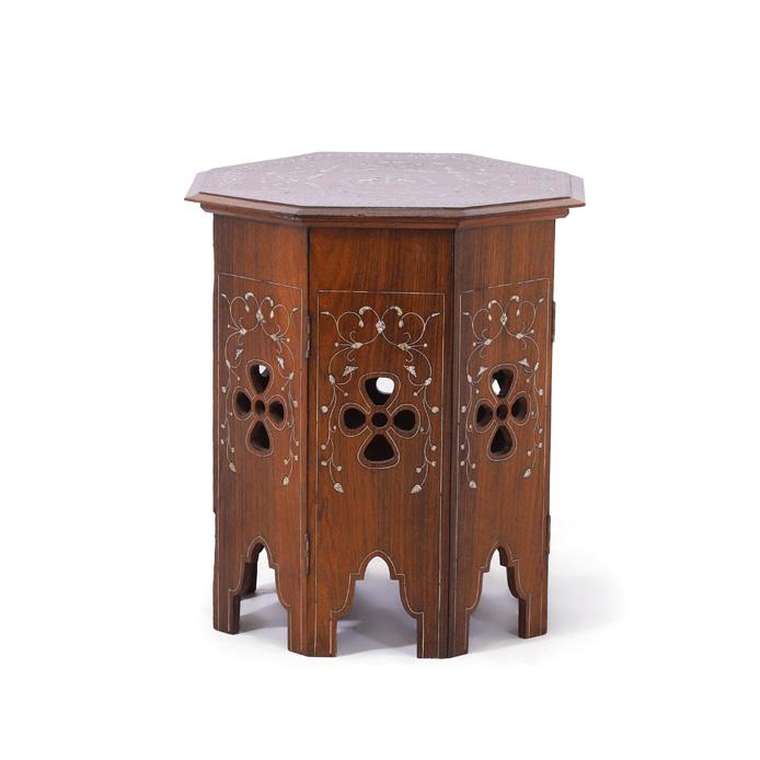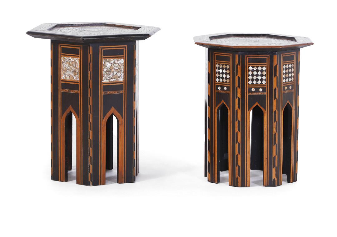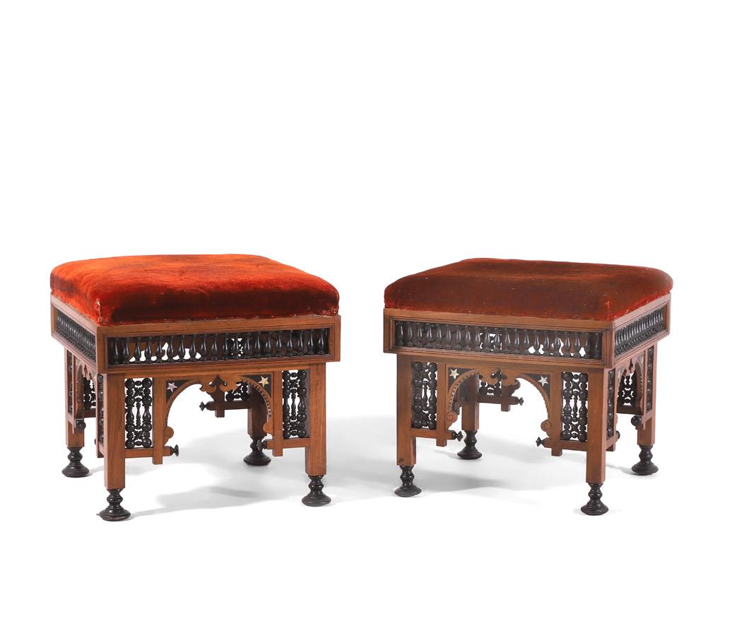 Giuseppe Parvis (1831-1909) holds an important position in late nineteenth-century Italian furniture design, in particular, for his eclectic engagement with non-European sources, especially North African and Islamic visual traditions. In a period marked by colonial expansion and intensified Mediterranean exchange, Parvis incorporated Moorish and Maghrebi motifs into furniture that combined exotic ornament with European forms. His works feature geometric surface patterning, horseshoe arches, cusped profiles, and inlaid or polychrome decoration, adapted from Islamic architectural vocabulary.