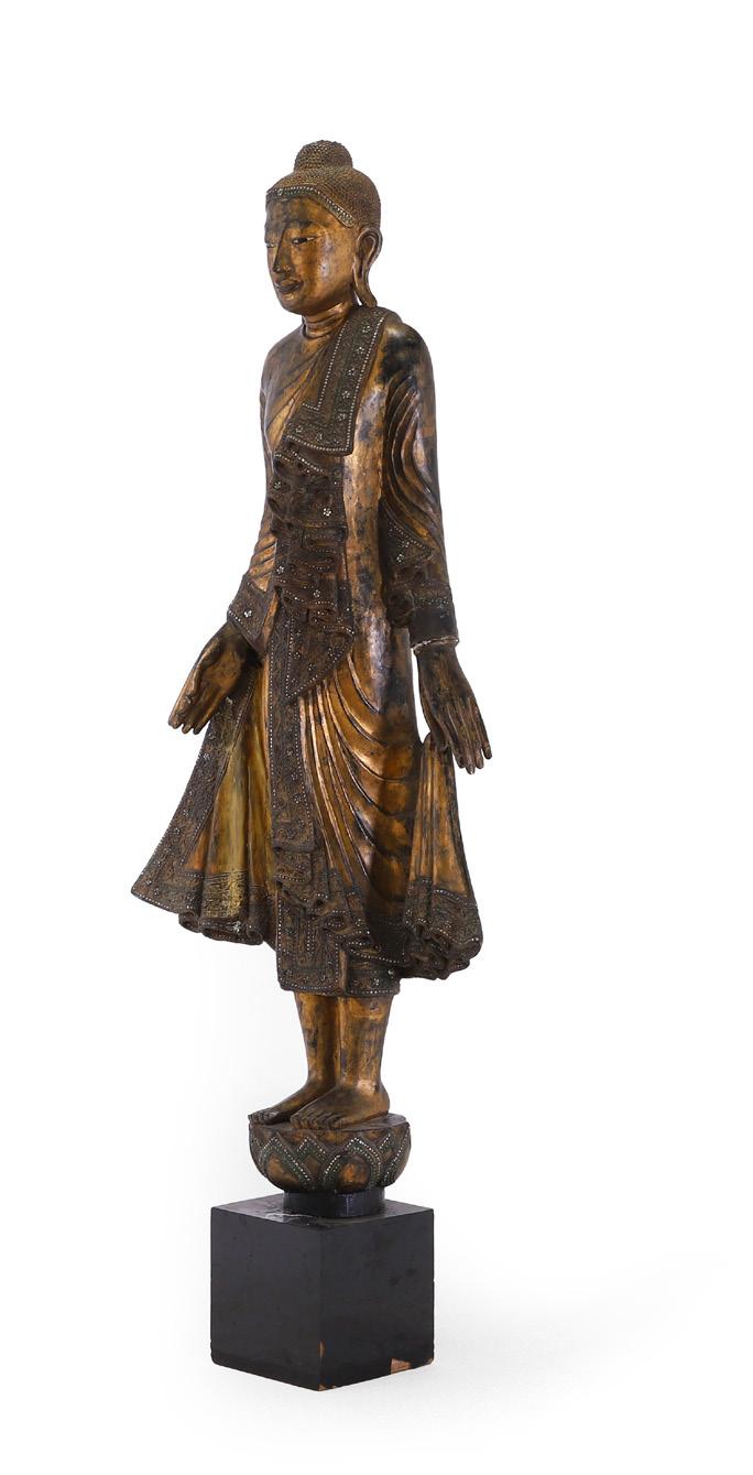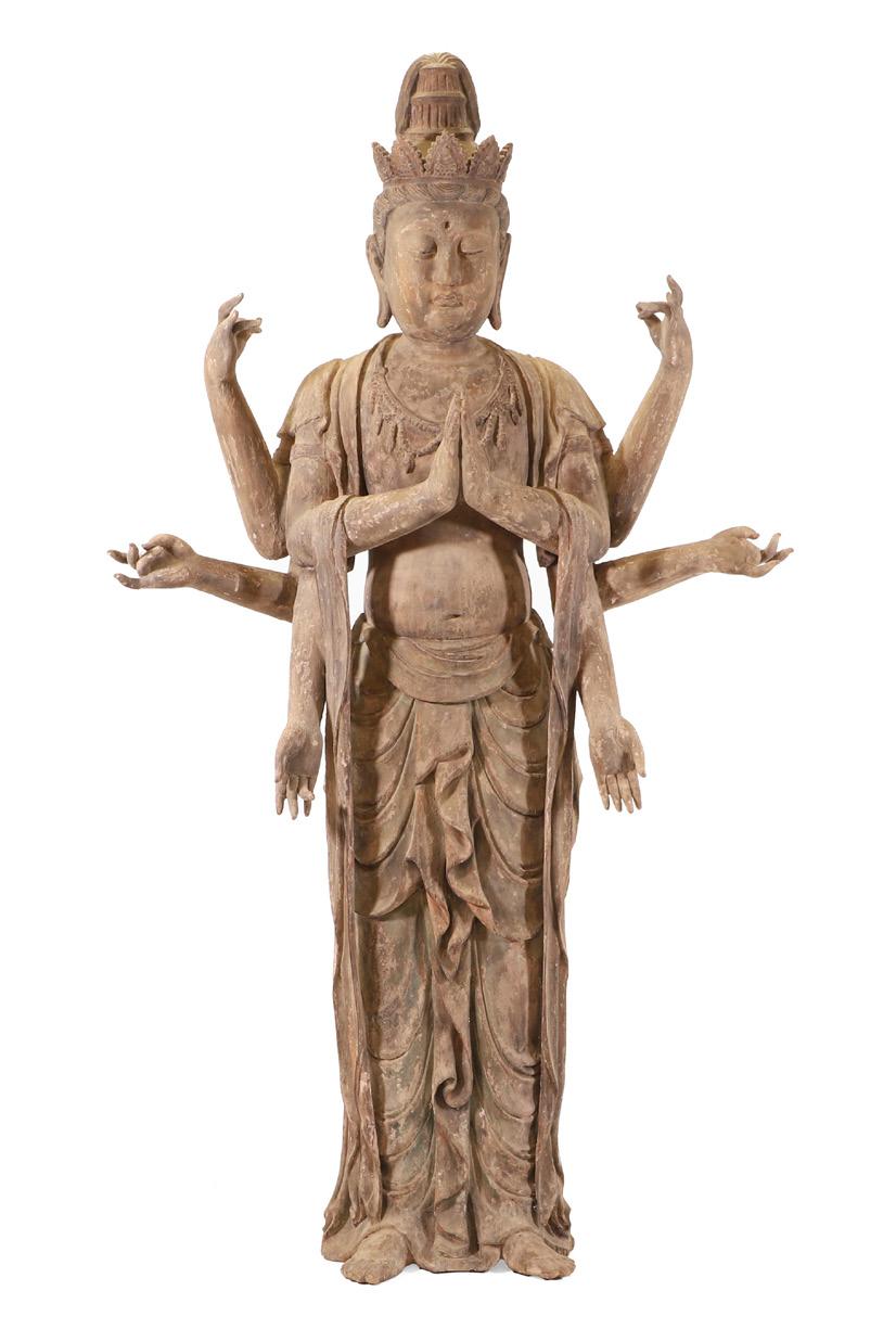 A carved wood and gesso moulded figure of the eight-armed Avalokiteshvara, 19th-20th century, Chinese, modelled in a praying position with six arms enclosing the body