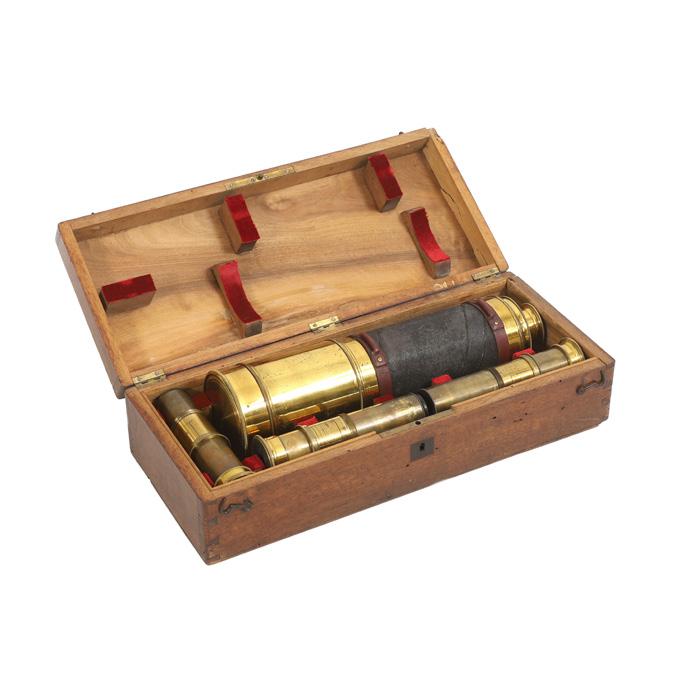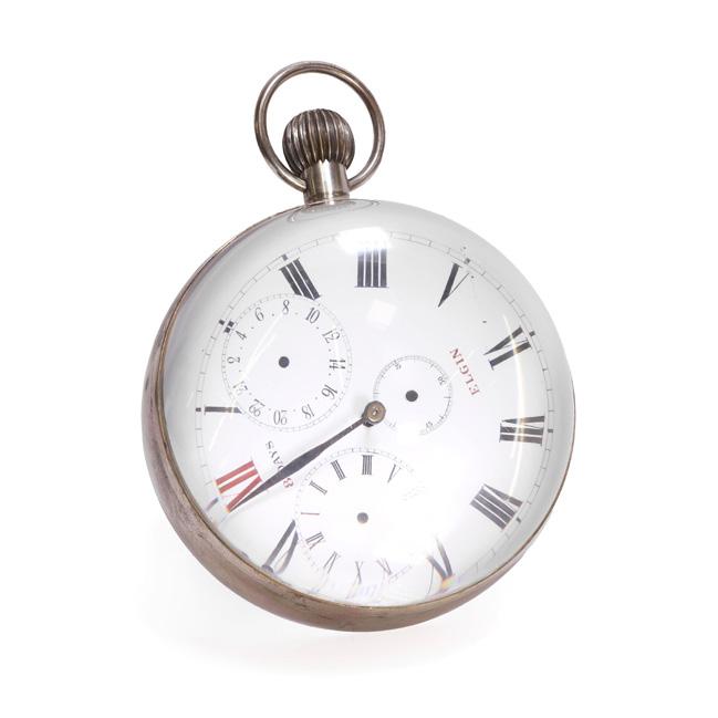 A Chinese export gilt-brass automaton table clock, early to mid-19th century, probably Guangzhou workshops, the arched gilt-brass case surmounted by an orb finial over a glazed door and shell and husk cresting, the sides fitted with pierced and chased oval fret panels and raised on four leaf-scroll feet on a fixed plinth, the convex white enamel dial with pierced gilt-brass hands and chased gilt spandrels, surmounted by a painted automaton scene depicting the figure of Chronos within a landscape, the twin-chain fusee movement with knife-edge verge escapement, short disc bob pendulum and bell strike, back-wound and engraved with Prince of Wales’ feathers