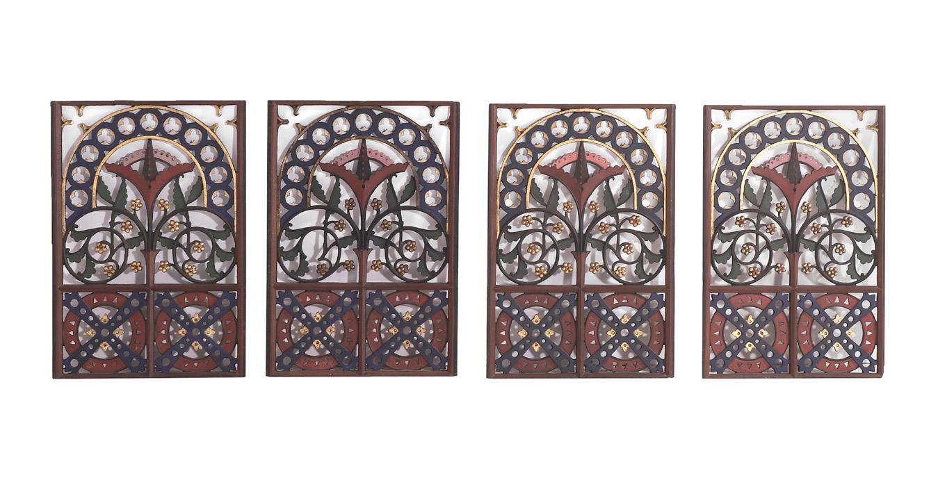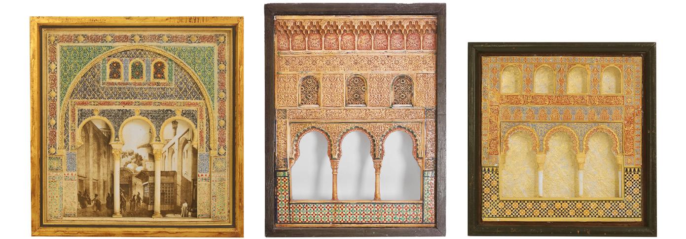 Attributed to Rafael Rus Acosta (Spanish, 1856-1912), three similar painted gesso Alhambra plaques, early 20th century, Spanish, Granada, each featuring triple colonnaded arches and decorated in polychrome, one impressed with maker’s mark largest 48 x 50cm (3)