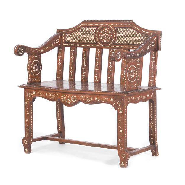 An Anglo-Indian teak and bone-inlaid window seat, late 19th/early 20th century, Hoshiarpur, the back with a shaped top over splats, open