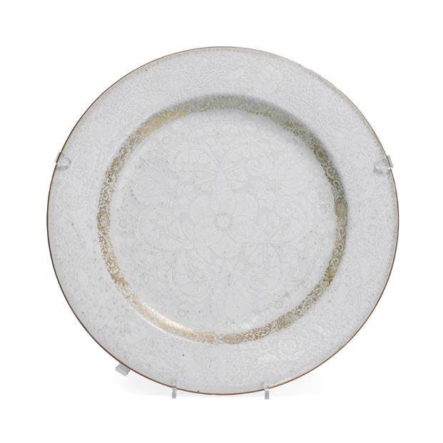 A large Chinese export charger, Qianlong (1736-1795), decorated in bianco-sopra-bianco with scrolling flowers picked out in pink and with a gilt band to the cavetto