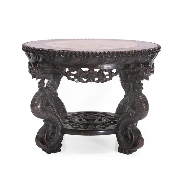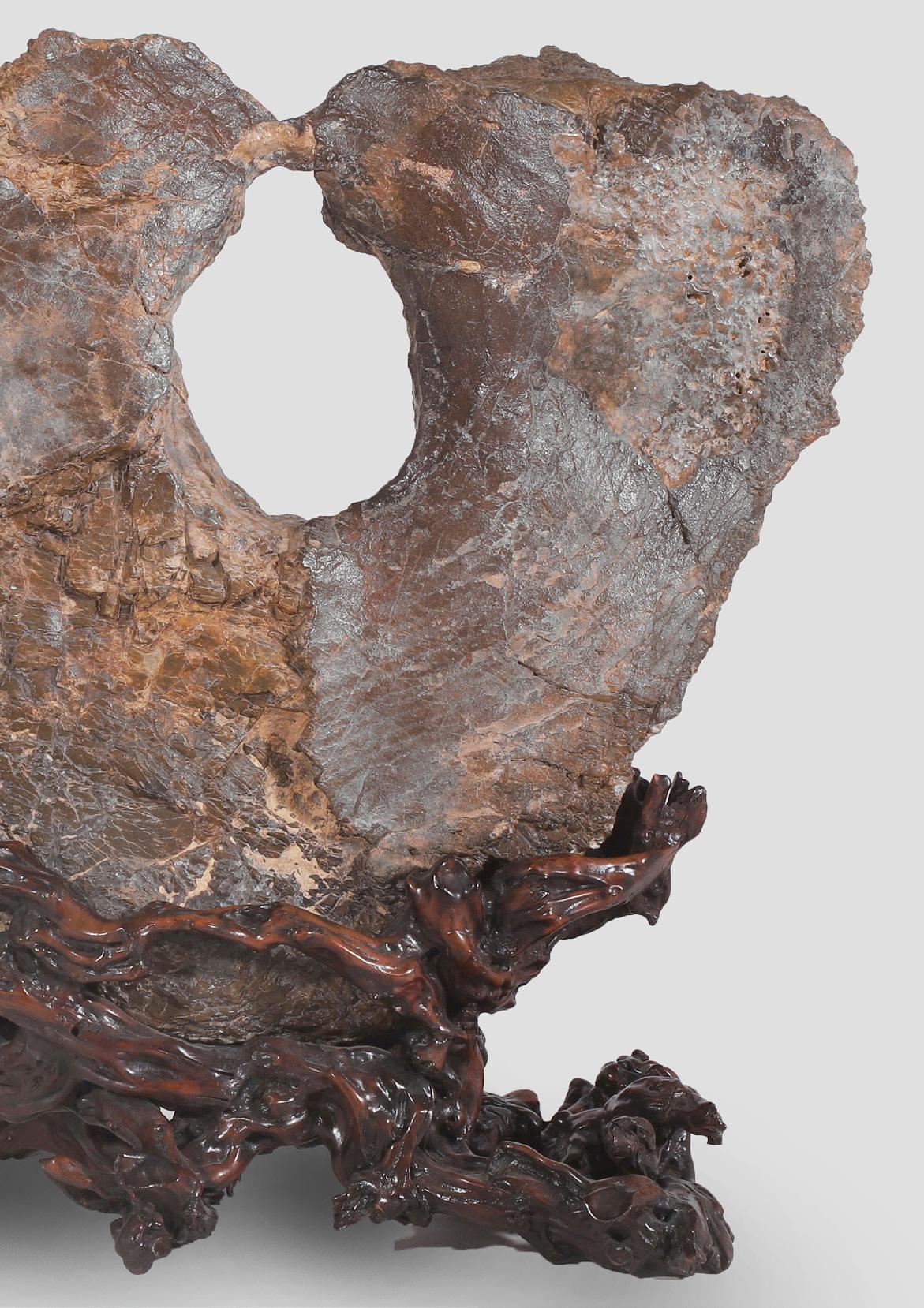 A scholar’s rock on stand, Qing dynasty (1644-1911), Chinese, the stone with a large opening, and of a brownish-green tone, raised on a twisted and knurled root carved stand