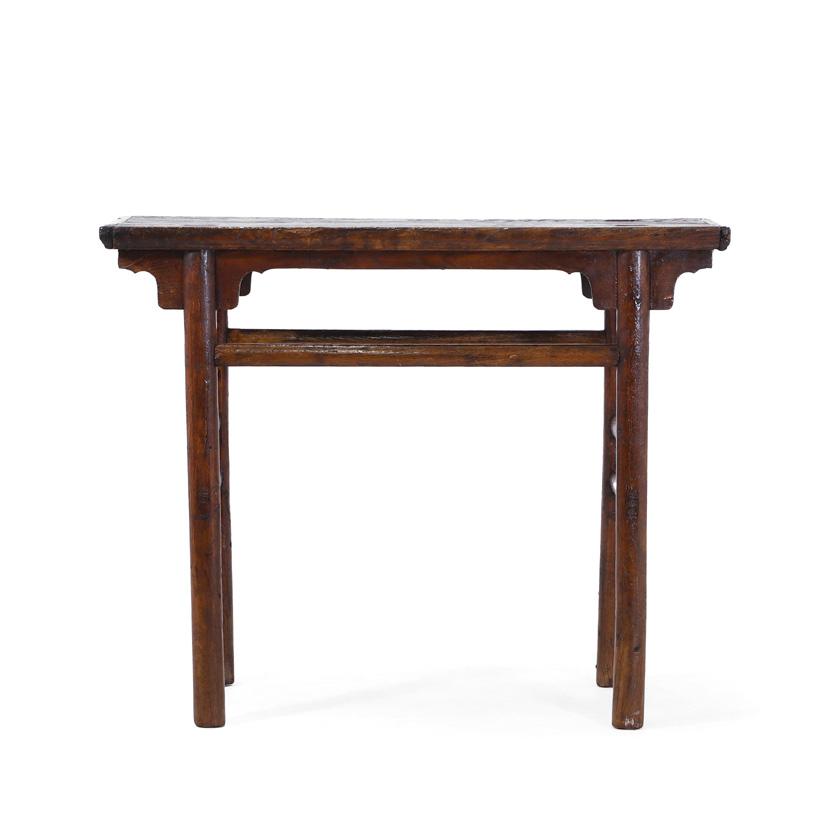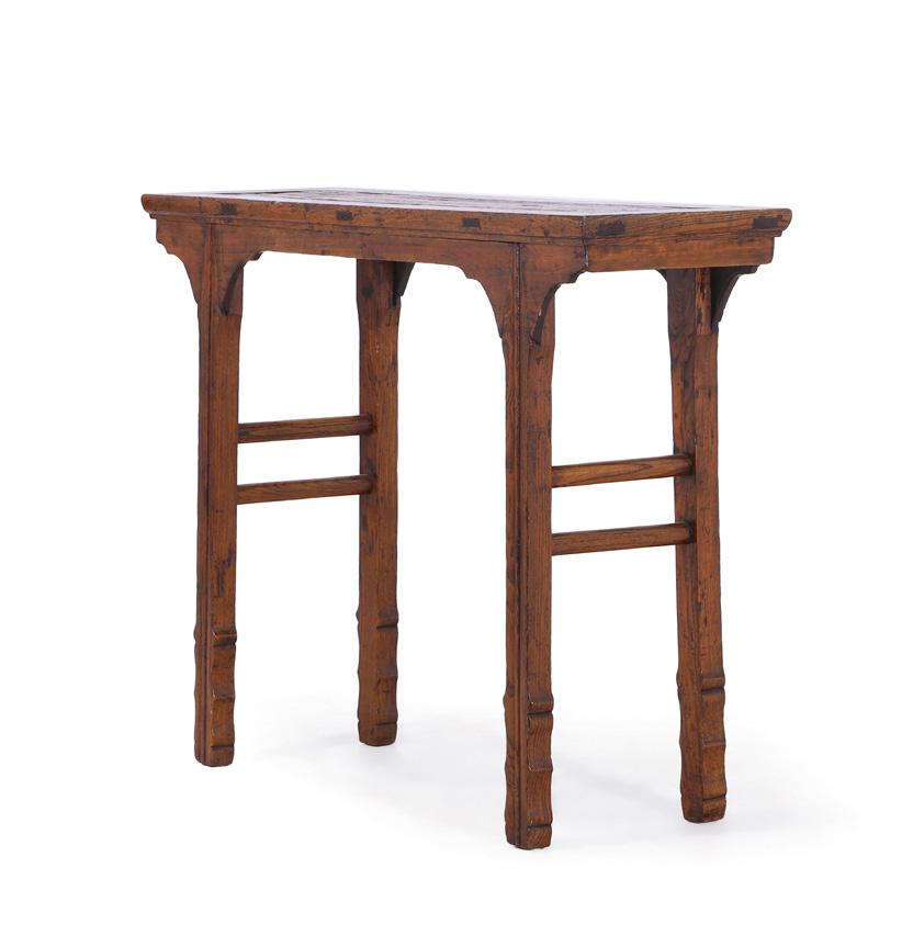 An elm altar table, Qing dynasty (1644-1911), Chinese, the planked top with cleated ends, raised on stretchered supports 108cm wide, 38cm deep, 88cm high