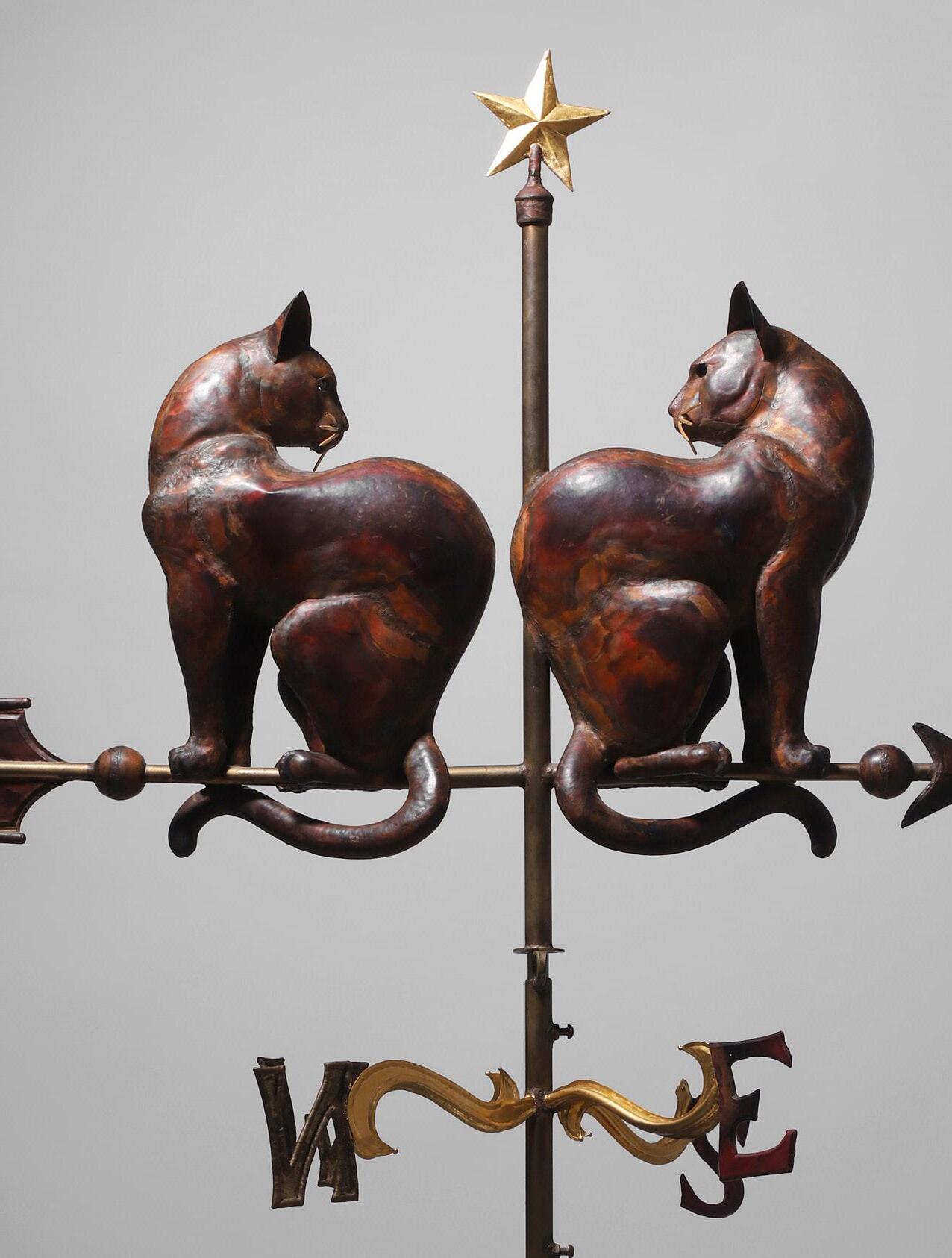 Karen Green (American, contemporary), ‘Zampa and Ami’, 2014, a copper and gilt-copper weathervane, modelled as two cats, raised on a hewn wooden plinth, stamped ‘Green 2014’