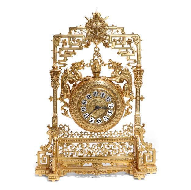 A gilt-brass Japonesque mantel timepiece, Circa 1880, French, the movement stamped ‘Victor Athanase-Pierret’, modelled as an ornate gong stand, the tic-tac movement with an enamelled cartouche dial on dragon brackets, the stand with column supports, united by a pierced panel on a trestle base 30.5cm wide, 10cm deep, 41cm high