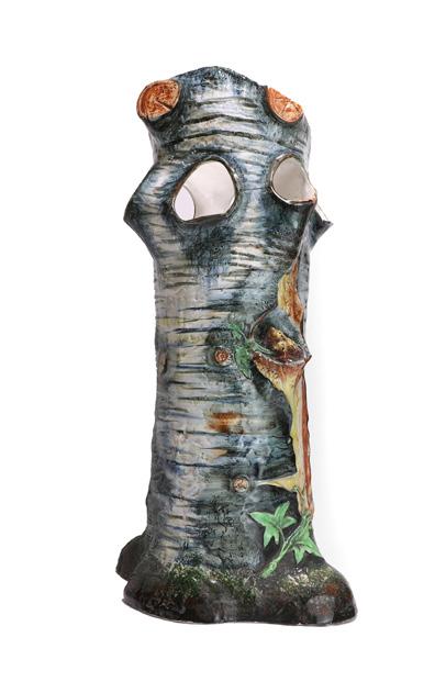 A Nimy majolica pottery stick stand, 20th century, Belgian, modelled as a silver birch tree trunk with stylised decoration, with Nimy factory marks to the underside 38cm wide, 28cm deep, 67cm high