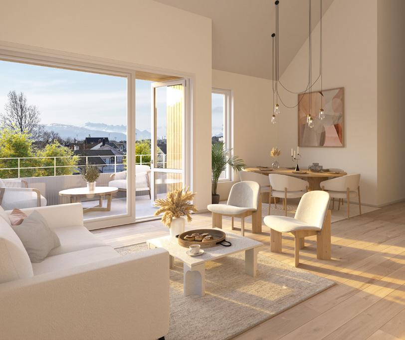 ↑ Store vindusflater og ekstra takhøyde gir leilighetene i Parkhusene et lyst og romslig preg, med utsikt som en naturlig del av interiøret. (Illustrasjon)